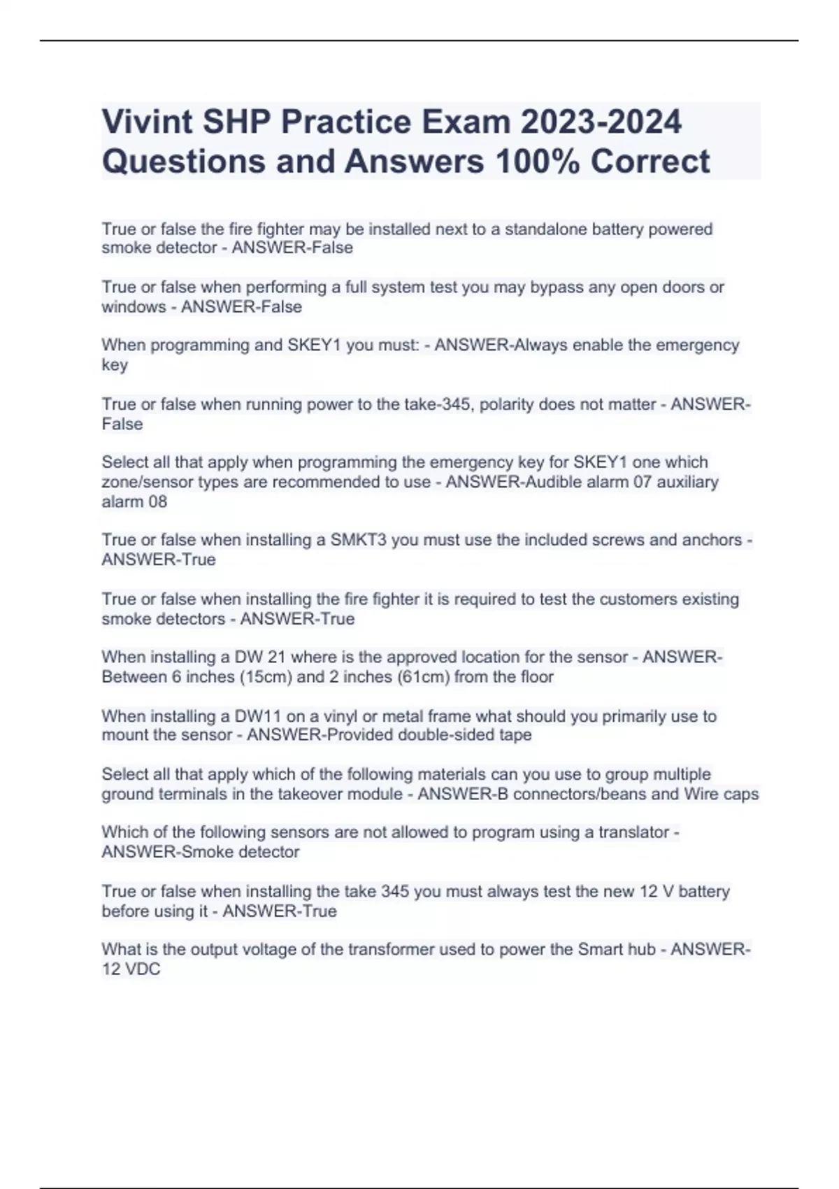 Vivint SHP Practice Exam Questions and Answers 100% Correct Vivint SHP Practice Exam Questions and Answers 100% Correct Vivint SHP Practice Exam Questions and Answers 100% Correct Vivint SHP Practice Exam Questions and Answers 100% Correct True or false the fire fighter may be installed next to a standalone battery powered smoke detector - ANSWER-False True or false when performing a full system test you may bypass any open doors or windows - ANSWER-False When programming and SKEY1 you must: - ANSWER-Always enable the emergency