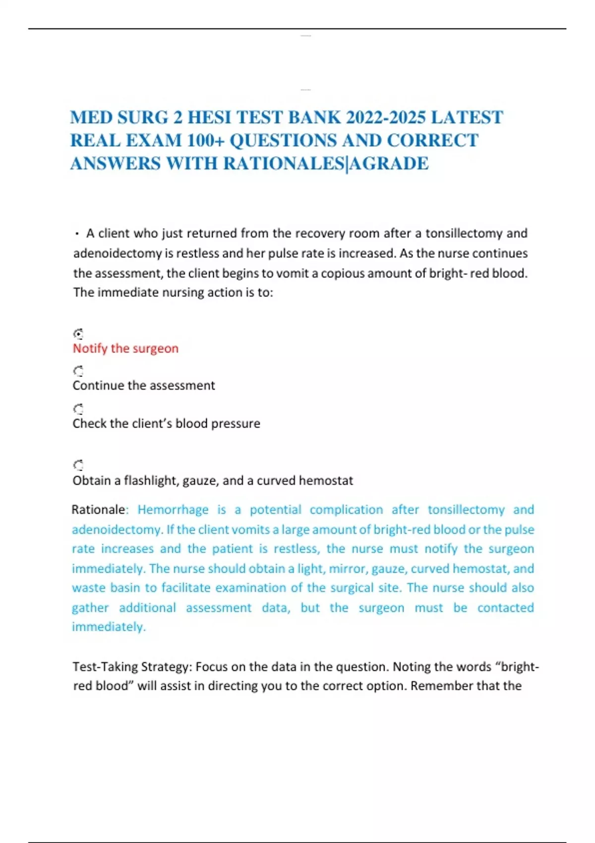 MED SURG 2 HESI TEST BANK LATEST REAL EXAM 100+ QUESTIONS AND CORRECT ANSWERS WITH RATIONALES|AGRADE • A client who just returned from the recovery room after a tonsillectomy and adenoidectomy is restless and her pulse rate is increased. As t