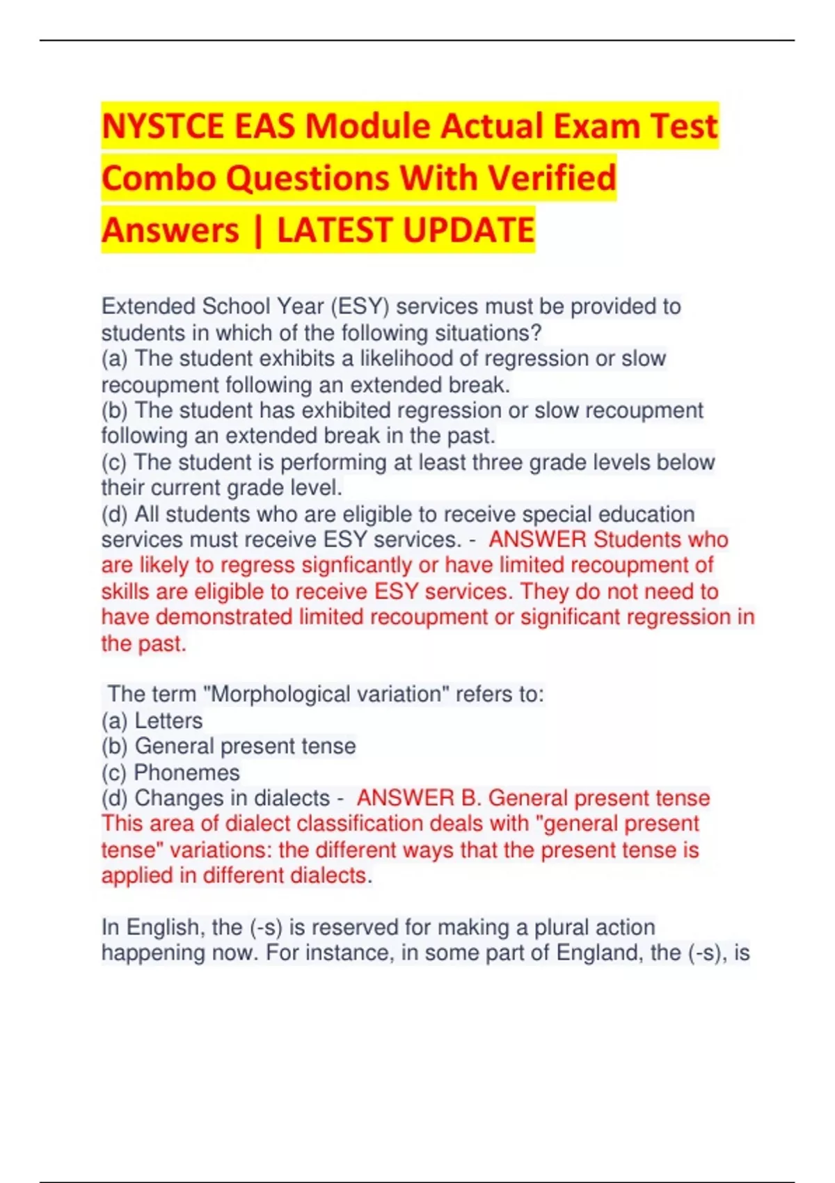 NYSTCE EAS Module Actual Exam Test Combo Questions With Verified Answers | LATEST UPDATE Extended School Year (ESY) services must be provided to students in which of the following situations? (a) The student exhibits a likelihood of regression or slow recoupment following an extended break. (b) The student has exhibited regression or slow recoupment following an extended break in the past. (c) The student is performing at least three grade levels below their current grade level. (d) All students who are eligible to receive special education services must receive ESY services. - ANSWER Students who are likely to regress signficantly or have limited recoupment of skills are eligible to receive ESY services. They do not need to have demonstrated limited recoupment or significant regression in the past. The term "Morphological variation" refers to: (a) Letters (b) General present tense (c) Phonemes (d) Changes in dialects - ANSWER B. General present tense This area of dialect classification deals with "general present tense" variations: the different ways that the present tense is applied in different dialects. In English, the (-s) is reserved for making a plural action happening now. For instance, in some part of England, the (-s), is reserved for marking the third person singular forms only, e.g., "I likes him". An individual under age three who might be likely to experience substantial developmental delays unless early intervention services are provided may be classified as which of the following? (a) An at-risk infant or toddler (b) A child with a disability (c) A child with cerebral palsy (d) An individual in need of services - ANSWER A. An individual under age three who might be likely to experience substantial developmental delays unless early intervention services are provided may be classified as an at-risk infant or toddler. Only infants and toddlers can be identified as "at-risk." Which model uses academic achievement testing and an IQ test to determine whether or not a child has a learning disability? (a) Educational model. (b) Psychological model. (c) Discrepancy model. (d) Cognitive model. - ANSWER C. Discrepancy model. The discrepancy model compares the results of the different tests. If there is a discrepancy between the psychological and academic evaluation, the child is considered to have a learning disability. Recording lectures is an effective accommodation for which of the following? (a)Hearing, visual, and behavioral impairments. (b) Cognitive, behavioral, and language delays. (c) Psychological, behavioral, and hearing delays. (d) Cognitive, psychological, and visual delays. - ANSWER D. Cognitive, psychological, and visual delays. Audio recordings of lectures allow students to better recall information from the lectures and apply it later. This is effective with students who have cognitive, psychological, and visual delays. Communication technologies that support learning might include all but which of the following? (a)Word processing programs (b)Spreadsheet programs (c) Publishing software (d)Televisions - ANSWER D. Televisions. Communication technologies that support learning might include word processing programs, spreadsheet programs, and publishing software. Asking a student to read aloud would be considered what form of teaching strategy? (a) Top-down (b) Bottom-up (c) Bottom-down (d) Top-up - ANSWER B. Botto