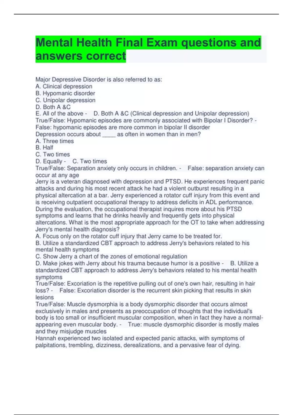 Mental Health Final Exam questions and answers correct Major Depressive Disorder is also referred to as: A. Clinical depression B. Hypomanic disorder C. Unipolar depression D. Both A &C E. All of the above - D. Both A &C (Clinical depression and Unipolar depression) True/False: Hypomanic episodes are commonly associated with Bipolar I Disorder? - False: hypomanic episodes are more common in bipolar II disorder Depression occurs about ____ as often in women than in men? A. Three times B. Half C. Two times D. Equally - C. Two times True/False: Separation anxiety only occurs in children. - False: separation anxiety can occur at any age Jerry is a veteran diagnosed with depression and PTSD. He experiences frequent panic attacks and during his most recent attack he had a violent outburst resulting in a physical altercation at a bar. Jerry experienced a rotator cuff injury from this event and is receiving outpatient occupational therapy to address deficits in ADL performance. During the evaluation, the occupational therapist inquires more about his PTSD symptoms and learns that he drinks heavily and frequently gets into physical altercations. What is the most appropriate approach for the OT to take when addressing Jerry's mental health diagnosis? A. Focus only on the rotator cuff injury that Jerry came to be treated for. B. Utilize a standardized CBT approach to address Jerry's behaviors related to his mental health symptoms C. Show Jerry a chart of the zones of emotional regulation D. Make jokes with Jerry about his trauma because humor is a positive - B. Utilize a standardized CBT approach to address Jerry's behaviors related to his mental health symptoms True/False: Excoriation is the repetitive pulling out of one's own hair, resulting in hair loss? - False: Excoriation disorder is the recurrent skin picking that results in skin lesions True/False: Muscle dysmorphia is a body dysmorphic disorder that occurs almost exclusively in males and presents as preoccupation of thoughts that the individual's body is too small or insufficient muscular composition, when in fact they have a normalappearing even muscular body. - True: muscle dysmorphic disorder is mostly males and they misjudge muscles Hannah experienced two isolated and expected panic attacks, with symptoms of palpitations, trembling, dizziness, derealizations, and a pervasive fear of dying. True/False: She meets the criteria for p
