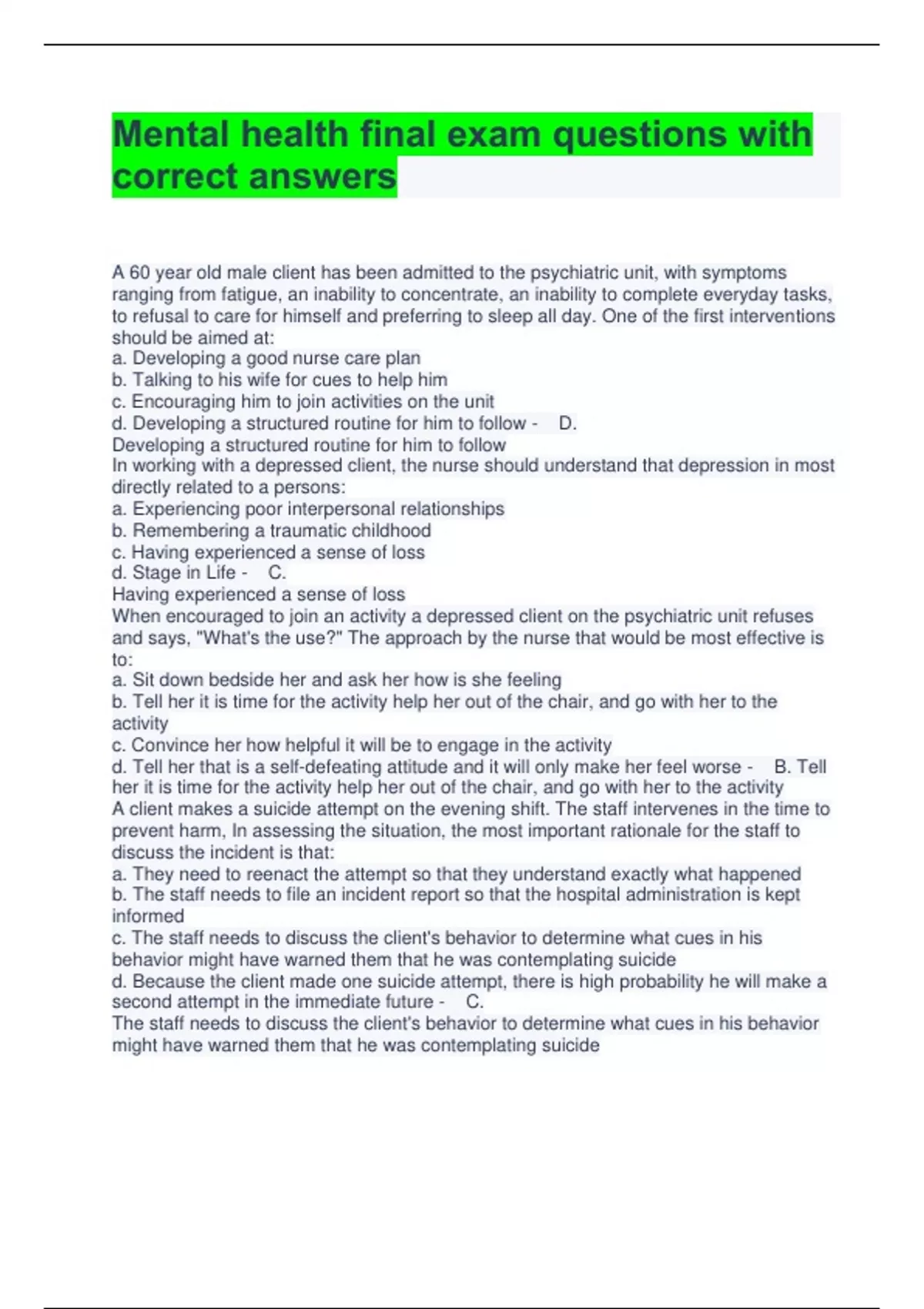 Mental health final exam questions with correct answers A 60 year old male client has been admitted to the psychiatric unit, with symptoms ranging from fatigue, an inability to concentrate, an inability to complete everyday tasks, to refusal to care for himself and preferring to sleep all day. One of the first interventions should be aimed at: a. Developing a good nurse care plan b. Talking to his wife for cues to help him c. Encouraging him to join activities on the unit d. Developing a structured routine for him to follow - D. Developing a structured routine for him to follow In working with a depressed client, the nurse should understand that depression in most directly related to a persons: a. Experiencing poor interpersonal relationships b. Remembering a traumatic childhood c. Having experienced a sense of loss d. Stage in Life - C. Having experienced a sense of loss When encouraged to join an activity a depressed client on the psychiatric unit refuses and says, "What's the use?" The approach by the nurse that would be most effective is to: a. Sit down bedside her and ask her how is she feeling b. Tell her it is time for the activity help her out of the chair, and go with her to the activity c. Convince her how helpful it will be to engage in the activity d. Tell her that is a self-defeating attitude and it will only make her feel worse - B. Tell her it is time for the activity help her out of the chair, and go with her to the activity A client makes a suicide attempt on the evening shift. The staff intervenes in the time to prevent harm, In assessing the situation, the most important rationale for the staff to discuss the incident is that: a. They need to reenact the attempt so that they understand exactly what happened b. The staff needs to file an incident report so that the hospital administration is kept informed c. The staff needs to discuss the client's behavior to determine what cues in his behavior might have warned them that he was contemplating suicide d. Because the client made one suicide attempt, there is high probability he will make a second attempt in the immediate future - C. The staff needs to discuss the client's behavior to determine what cues in his behavior might have warned them that he was contemplating suicide A client has the diagnosis of a manic episode. Her disruptive behavior on the unit has been increasingly annoying to the other clients. One intervention by the nurse might be to: a. Tell the client she is annoying others and confine her to her room b. ignore the client's behavior, realizing it is consistent with her illness c. Set limits on the client's behavior and be consistent in approach d. Make a rigid, structured plan that the client will have to follow - c. Set limits on the client's behavior and be consistent in approach Three days after admission for depression, a 54 year old female client approaches the nurse and says "I know I have cancer of the uterus. Can't you let me stay in bed and have some peace before I die?" In responding, the nurse must keep in mind that: a. The client must be postmenopausal b. Thoughts of disease are common in depressed clients c. Clients suffering from depression can b