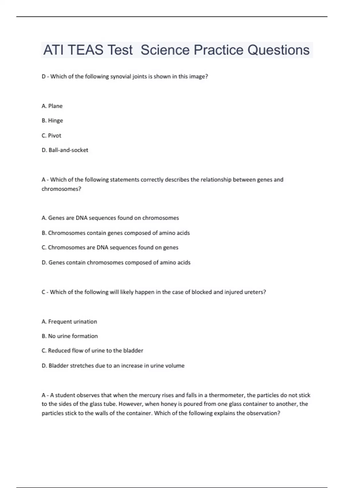 D - Which of the following synovial joints is shown in this image? A. Plane B. Hinge C. Pivot D. Ball-and-socket A - Which of the following statements correctly describes the relationship between genes and chromosomes? A. Genes are DNA sequences found on chromosomes B. Chromosomes contain genes composed of amino acids C. Chromosomes are DNA sequences found on genes D. Genes contain chromosomes composed of amino acids C - Which of the following will likely happen in the case of blocked and injured ureters? A. Frequent urination B. No urine formation C. Reduced flow of urine to the bladder D. Bladder stretches due to an increase in urine volume A - A student observes that when the mercury rises and falls in a thermometer, the particles do not stick to the sides of the glass tube. However, when honey is poured from one glass container to another, the particles stick to the walls of the container. Which of the following explains the observation? A. Mercury is more cohesive and less adhesive than honey B. Mercury is less cohesive and more adhesive than honey C. Mercury is less cohesive and less adhesive than honey D. Mercury is more cohesive and more adhesive than honey A - Acid reflux is a condition in which the gastric juices of the stomach flow backward into the esophagus. Which of the following causes acid reflux? A. The cardiac sphincter does not close tightly B. Peristalsis occurs slowly in the esophagus