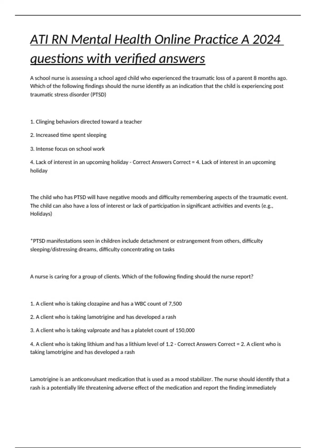 A school nurse is assessing a school aged child who experienced the traumatic loss of a parent 8 months ago. Which of the following findings should the nurse identify as an indication that the child is experiencing post traumatic stress disorder (PTSD) 1. Clinging behaviors directed toward a teacher 2. Increased time spent sleeping 3. Intense focus on school work 4. Lack of interest in an upcoming holiday - Correct Answers Correct = 4. Lack of interest in an upcoming holiday The child who has PTSD will have negative moods and difficulty remembering aspects of the traumatic event. The child can also have a loss of interest or lack of participation in significant activities and events (e.g., Holidays) *PTSD manifestations seen in children include detachment or estrangement from others, difficulty sleeping/distressing dreams, difficulty concentrating on tasks A nurse is caring for a group of clients. Which of the following finding should the nurse report? 1. A client who is taking clozapine and has a WBC count of 7,500 2. A client who is taking lamotrigine and has developed a rash 3. A client who is taking valproate and has a platelet count of 150,000 4. A client who is taking lithium and has a lithium level of 1.2 - Correct Answers Correct = 2. A client who is taking lamotrigine and has developed a rash Lamotrigine is an anticonvulsant medication that is used as a mood stabilizer. The nurse should identify that a rash is a potentially life threatening adverse effect of the medication and report the finding immediately A nurse is reviewing laboratory results for a client who has schizophrenia and is taking clozapine. Which of the following values should the nurse identify as contraindication for receiving clozapine? 1. WBC count 2,500 2. Hgb 11.5 3. Platelets 150,000 4. RBC count 3.5 - Correct Answers Correct - 1. WBC count 2,500 Clozapine can cause agranulocytosis, which can be fatal due to overwhelming infection. The nurse should identify a WBC count of less than 3,000 as a possible manifestation of agranulocytosis and should withhold the medication and notify the provider A nurse is planning care for a client who has depression and has made frequent suicide attempts. Which of the following statements indicates the client has a decreased risk for suicide? 1. "I'm relieved now that my financial affairs are in order." 2. "It is easier to talk about my feelings now." 3. "Suddenly I have enough energy to do anything I want." 4. "Thank you for always taking such good care of me." - Correct Answers Correct - 2. "It is easier to talk about my feelings now." When clients express their feelings, this indicates a positive treatment outcome *When clients who have depression verbalize getting their affairs in order, or suddenly have more energy are at an increased risk of suicide. Clients who have depression often show an appreciation for loved ones when they are contemplating suicide During a client's initial interview in a mental health inpatient setting, a nurse identifies that the client is maintaining eye contact and leaning forward. Which of the following assumptions should the nurse make based on the client's nonverbal behaviors? 1. The client is interested in what the nurse is saying 2. The client is attempting to manipulate the nurse 3. The client is physically attracted to the nurse 4. The client is seeking acceptance by the nurse - Correct Answers Correct - 1. The client is interested in what the nurse is saying The client's posture and eye contact demonstrate an interest in the interview and what the nurse is saying A nurse is planning care for a client who has schizophrenia and reports auditory hallucinations. Which of the following interventions should the nurse include in the plan? 1. Promote use of music to compete with the client's auditory hallucination 2. Inform the client that the auditory hallucinations are not real 3. Avoid asking the client if they are experiencing auditory hallucinations 4. Instruct the client on the use of voice recognition regarding the auditory hallucinations - Correct Answers Correct = 1. Promote the use of music to compete with the client's auditory hallucinations Competing reality based stimulating such as the use of music or television during auditory hallucinations can assist in limiting the effect the hallucinations have on the client's stress level *The nurse should acknowledge that the client is hearing auditory hallucinations, but should tell the client that others cannot hear anything to reinforce reality. The nurse should ask the client if they are hearing voices to evaluate whether these are command hallucinations, which can place the client or others at risk for harm. The nurse should assist the client to develop the skill of voice dismissal when auditory hallucinations occur. This involves commanding the voices to stop, which gives the client a sense of control