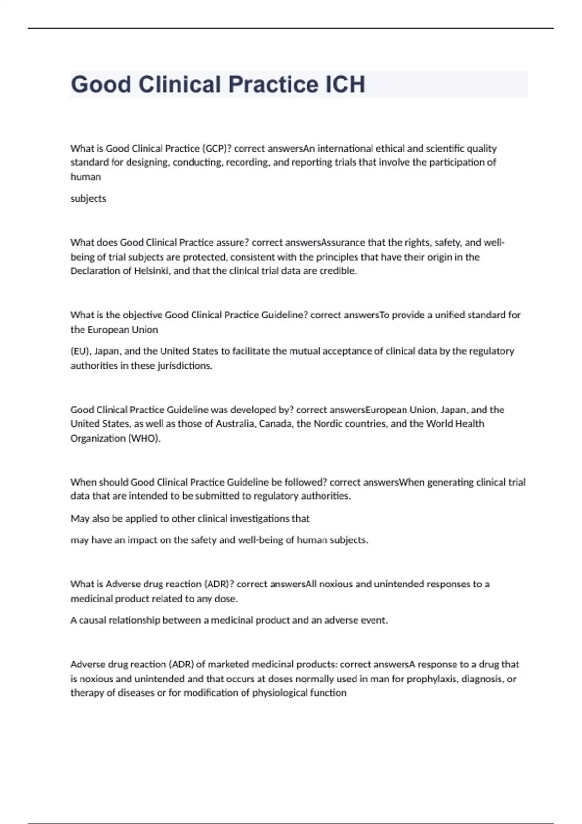 What is Good Clinical Practice (GCP)? correct answersAn international ethical and scientific quality standard for designing, conducting, recording, and reporting trials that involve the participation of human subjects What does Good Clinical Practice assure? correct answersAssurance that the rights, safety, and well-being of trial subjects are protected, consistent with the principles that have their origin in the Declaration of Helsinki, and that the clinical trial data are credible. What is the objective Good Clinical Practice Guideline? correct answersTo provide a unified standard for the European Union (EU), Japan, and the United States to facilitate the mutual acceptance of clinical data by the regulatory authorities in these jurisdictions. Good Clinical Practice Guideline was developed by? correct answersEuropean Union, Japan, and the United States, as well as those of Australia, Canada, the Nordic countries, and the World Health Organization (WHO). When should Good Clinical Practice Guideline be followed? correct answersWhen generating clinical trial data that are intended to be submitted to regulatory authorities. May also be applied to other clinical investigations that may have an impact on the safety and well-being of human subjects. What is Adverse drug reaction (ADR)? correct answersAll noxious and unintended responses to a medicinal product related to any dose. A causal relationship between a medicinal product and an adverse event. Adverse drug reaction (ADR) of marketed medicinal products: correct answersA response to a drug that is noxious and unintended and that occurs at doses normally used in man for prophylaxis, diagnosis, or therapy of diseases or for modification of physiological function