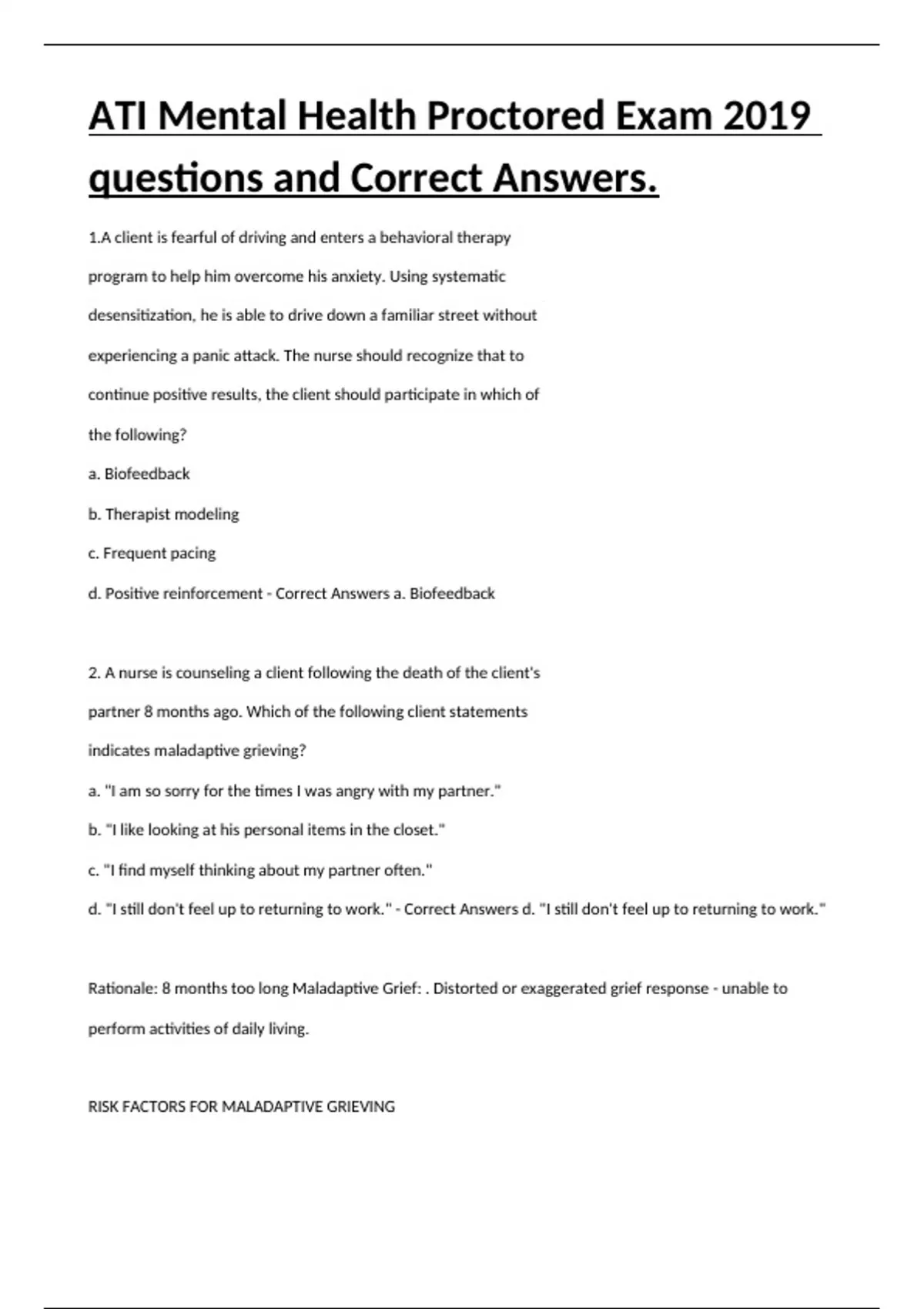 1.A client is fearful of driving and enters a behavioral therapy program to help him overcome his anxiety. Using systematic desensitization, he is able to drive down a familiar street without experiencing a panic attack. The nurse should recognize that to continue positive results, the client should participate in which of the following? a. Biofeedback b. Therapist modeling c. Frequent pacing d. Positive reinforcement - Correct Answers a. Biofeedback 2. A nurse is counseling a client following the death of the client's partner 8 months ago. Which of the following client statements indicates maladaptive grieving? a. "I am so sorry for the times I was angry with my partner." b. "I like looking at his personal items in the closet." c. "I find myself thinking about my partner often." d. "I still don't feel up to returning to work." - Correct Answers d. "I still don't feel up to returning to work." Rationale: 8 months too long Maladaptive Grief: . Distorted or exaggerated grief response - unable to perform activities of daily living. RISK FACTORS FOR MALADAPTIVE GRIEVING ●● Being dependent upon the deceased ●● Unexpected death at a young age, through violence, or by a socially unacceptable manner ●● Inadequate coping skills or lack of social support ●● Pre-existing mental health issues, such as depression or substance use disorder 3./21 A nurse in an inpatient mental health facility is assessing a client who has schizophrenia and is taking haloperidol (antipsychotic, 1st gen). Which of the following clinical findings is the nurse's priority? a. Headache b. Insomnia (sedation) c. Urinary hesitancy (Complication → ANTIcholinergic effects) d. High fever (Complication → agranulocytosis) - Correct Answers d. High fever (Complication → agranulocytosis) Other complications: Acute dystonia, Pseudoparkinsonism, Akathisia, Tardive dyskinesia, Neuroendocrine effects (Gynecomastia, Weight gain, Menstrual irregularities), NMS, Orthostatic Hypotension, Sedation, Sexual dysfunction, Skin effects, Liver impairment 4. A nurse is planning care for a client who has obsessive compulsive disorder. Which of the following recommendations should the nurse include in the client's plan of care? a. Reality Orientation therapy (re-orient to reality) b. Operant Conditioning (receives positive rewards for positive behavior) c. Thought Stopping (say "stop" when compulsive behaviors arise & substitute w/ positive thought) d. Validation Therapy (acknowledging pt's feelings) - Correct Answers c. Thought Stopping (say "stop" when compulsive behaviors arise & substitute w/ positive thought) 5. A nurse is caring for a client who is in the manic phase of bipolar disorder. Which of the following actions should the nurse take? a. Provide in depth explanation of nursing expectations (inability to focus - give concise explanations) b. Encourage the client to participate in group activities (decrease stimulation) c. Avoid power struggles by remaining neutral (do not react personally to pt's comments) d. Allow the client to set limits for his behavior (nurse sets limits) - Correct Answers c. Avoid power struggles by remaining neutral (do not react personally to pt's comments) 6. A nurse is providing behavioral therapy for a client who has OCD. The client repeatedly checks that the doors are locked at night. Which of the following instructions should the nurse give the client when using thought stopping technique? a. "Keep a journal of how often you check the locks each night." b. "Ask a family member to check the locks for you at night." c. "Focus on abdominal breathing whenever you go to check the locks." d. "Snap a rubber band on your wrist when you think about checking the locks." - Correct Answers d. "Snap a rubber band on your wrist when you think about checking the locks." Thought stopping: teach pt to say "stop" when negative thoughts/compulsive behaviors arise & substitute positive thought - goal forpt use command silently over time 7. A nurse is caring for a client who has a cocaine use disorder. Which of the following manifestations should the nurse expect the client to have during withdrawal? a. Hand tremors (Intoxication) b. Fatigue c. Seizures (Intoxication) d. Rapid speech Rationale: Pg: 97 WITHDRAWAL MANIFESTATIONS● Depression, fatigue, craving, excess sleeping or insomnia, dramatic unpleasant dreams, psychomotor retardation, agitation ● Not life-threatening, but possible occurrence of suicidal ideation Cocaine = STIMULANT → OPPOSITE of HEROIN ● Withdrawal = opposite effects - Correct Answers b. Fatigue 8. A nurse is reviewing the medical record of a client who is taking clozapine. For which of the following findings should the nurse withhold the medication and notify the provider? a. WBC count b. Heart rate c. Report of photosensitivity d. Blood glucose level - Correct Answers a. WBC count
