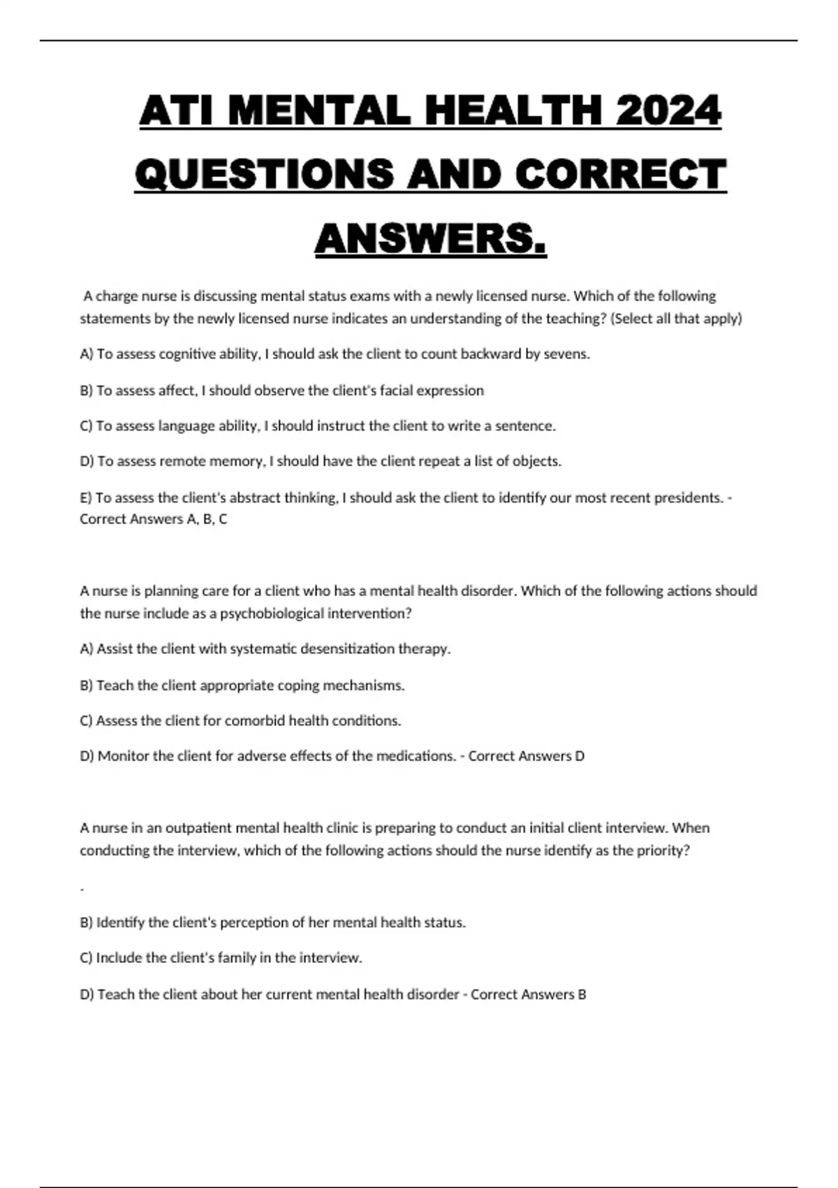 ATI MENTAL HEALTH 2024 QUESTIONS AND CORRECT ANSWERS.