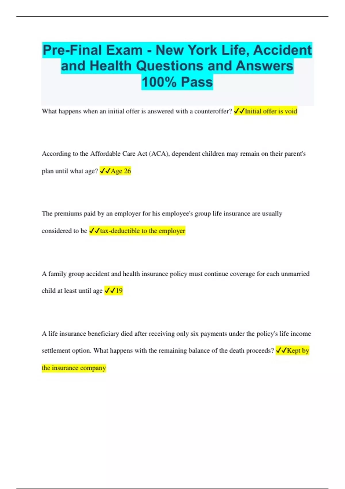 Pre-Final Exam - New York Life, Accident and Health Questions and Answers 100% Pass