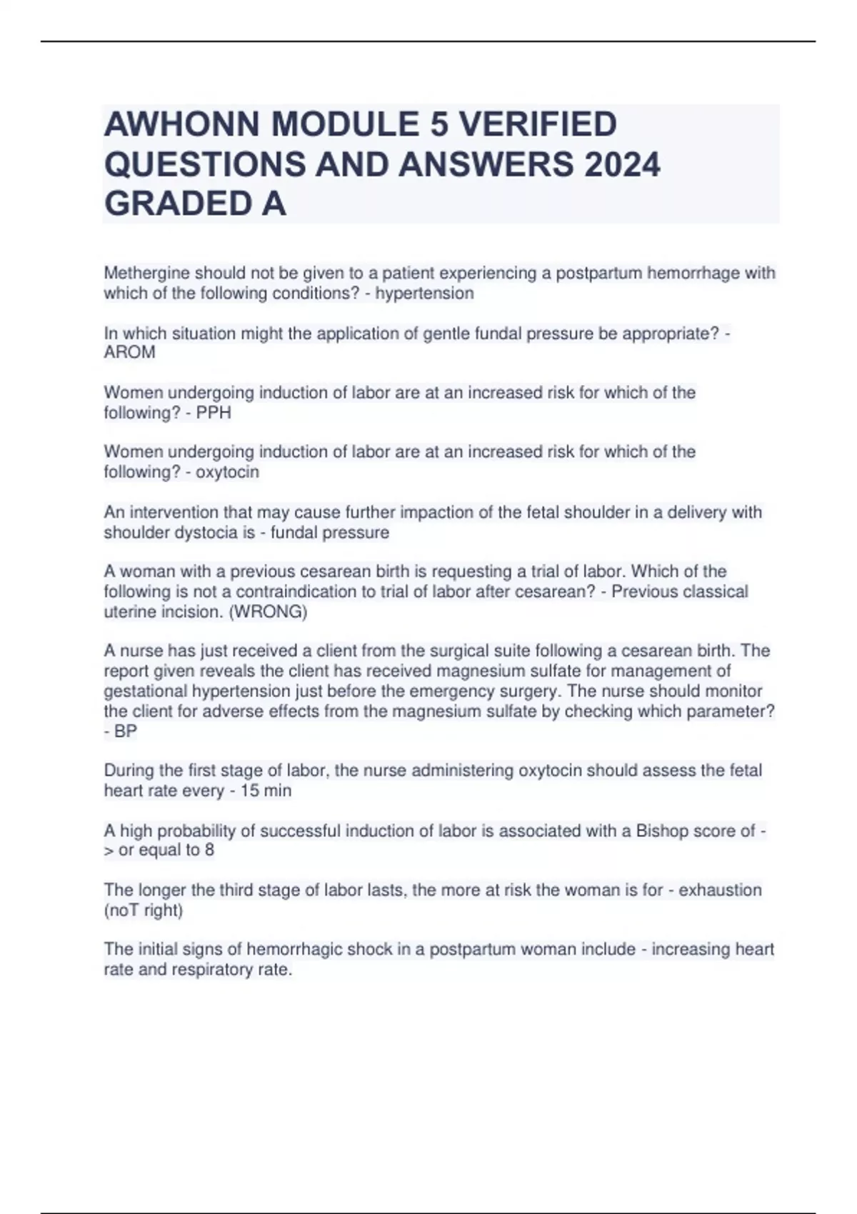AWHONN MODULE 5 VERIFIED QUESTIONS AND ANSWERS 2024 GRADED A
