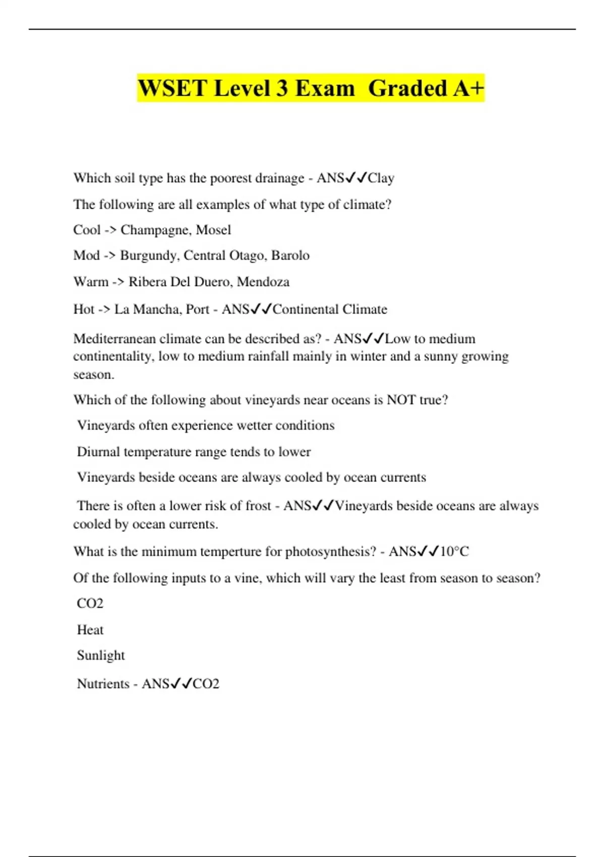 WSET Level 3 Exam 2024 Graded A+ 4. / Name 2 most important species of vine - ANSVitis vinifera - eurasian American vines 4. / Disadvantage & Advantage of american vines ? - ANSUnattractive flavour of the wines But resistant to phylloxera - used for rootstocks 4. / What is phylloxera ? - ANSVine pest (insect) that attacks vine's root Native from north america 4. / When was phylloxera introduced in europe ? - ANSEnd of 19th century 4. / How phylloxera destroy the vines ? - ANSInfection enter through the feeding wounds - vine is weakened and over a few year dies 4 / Places in the world without phylloxera ? - ANSYes : chile, some parts of argentina and south australia. 4. / How to fight phylloxera ? - ANS- Strict quarantine for non affected areas. - plant american species or hybrid - Grafting vitis vinifera onto rootstock of american vines 4. / What are the 2 grafting techniques existing ? - ANSBench grafting - in nurseries Head grafting - in vineyards 4. / What is the advantage of head grafting ? - ANSQuickly change an establish vineyards to a new grape variety taking advanyage of established root syst Grape at next vintage / instead of waiting 3 years Considerably cheaper than replanting 4. / Four sections of vines ? - ANSGreen parts One year old wood Permanent wood Roots 4. / What are the leaves responsible for ? - ANSPhotosynthesis 4. / What is photosynthesis process ? - ANSPlant use sunlight to convert carbon dioxide and water into glucose and oxygen 4. / What are vine flowers representing ? - ANSVine reproductive organs - both male and female 4. / What is inflorescences ? - ANSA bunch