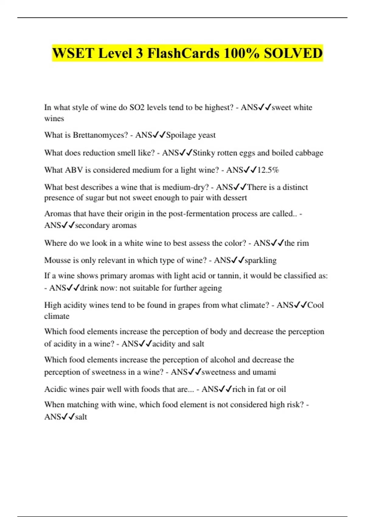WSET Level 3 FlashCards 100% SOLVED In what style of wine do SO2 levels tend to be highest? - ANSsweet white wines What is Brettanomyces? - ANSSpoilage yeast What does reduction smell like? - ANSStinky rotten eggs and boiled cabbage What ABV is considered medium for a light wine? - ANS12.5% What best describes a wine that is medium-dry? - ANSThere is a distinct presence of sugar but not sweet enough to pair with dessert Aromas that have their origin in the post-fermentation process are called.. - ANSsecondary aromas Where do we look in a white wine to best assess the color? - ANSthe rim Mousse is only relevant in which type of wine? - ANSsparkling If a wine shows primary aromas with light acid or tannin, it would be classified as: - ANSdrink now: not suitable for further ageing High acidity wines tend to be found in grapes from what climate? - ANSCool climate Which food elements increase the perception of body and decrease the perception of acidity in a wine? - ANSacidity and salt Which food elements increase the perception of alcohol and decrease the perception of sweetness in a wine? - ANSsweetness and umami Acidic wines pair well with foods that are... - ANSrich in fat or oil When matching with wine, which food element is not considered high risk? - ANSsalt What pairing should you never do with food and wine? - ANSpair bitter/tannic wine with bitter foods What are the 4 methods to combat spring frost? - ANS1) heaters 2) wind machines 3) sprinklers 4) thoughtful vineyard de