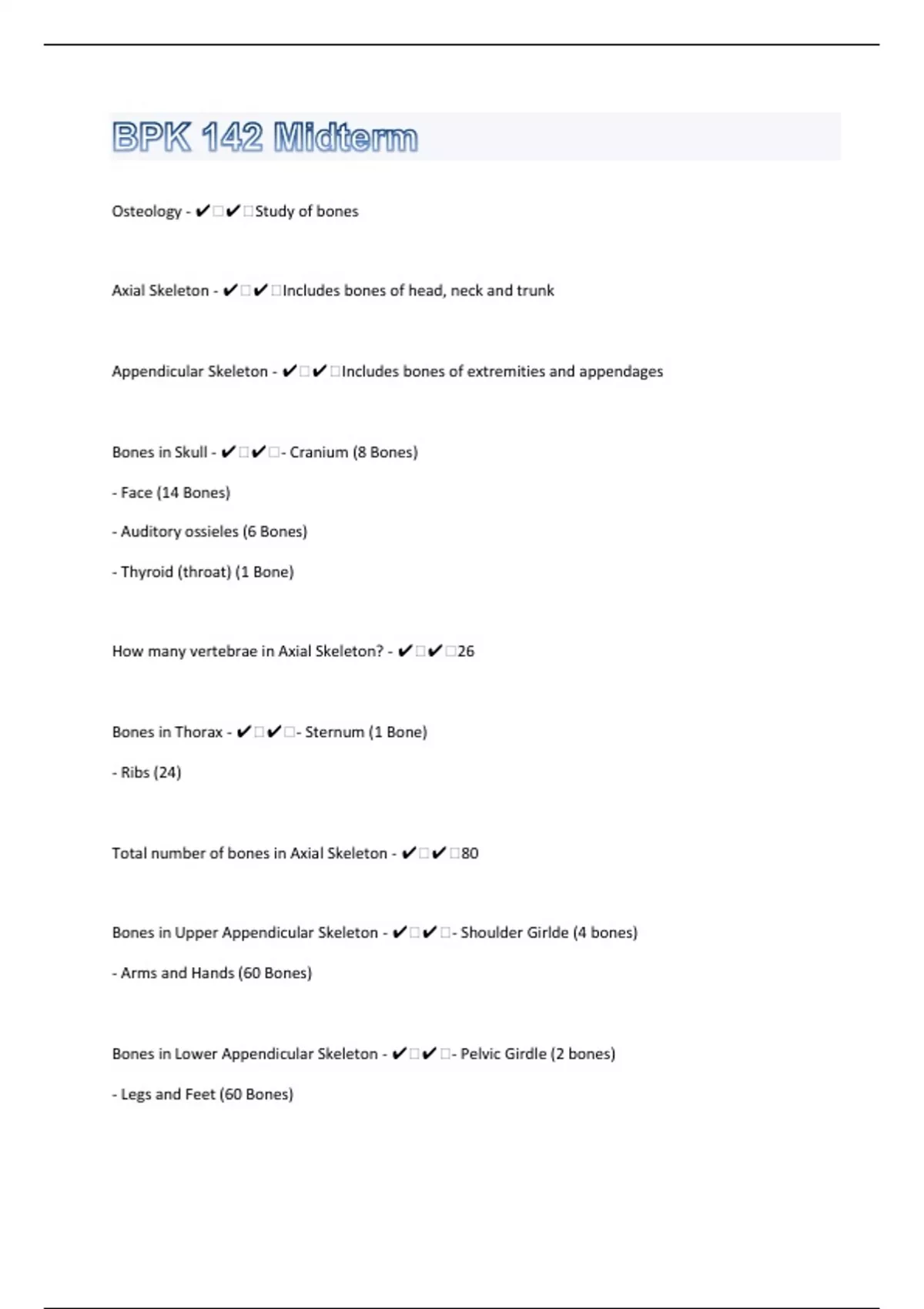 Osteology - ️️Study of bones Axial Skeleton - ️️Includes bones of head, neck and trunk Appendicular Skeleton - ️️Includes bones of extremities and appendages Bones in Skull - ️️- Cranium (8 Bones) - Face (14 Bones) - Auditory ossieles (6 Bones) - Thyroid (throat) (1 Bone) How many vertebrae in Axial Skeleton? - ️️26 Bones in Thorax - ️️- Sternum (1 Bone) - Ribs (24) Total number of bones in Axial Skeleton - ️️80 Bones in Upper Appendicular Skeleton - ️️- Shoulder Girlde (4 bones) - Arms and Hands (60 Bones) Bones in Lower Appendicular Skeleton - ️️- Pelvic Girdle (2 bones) - Legs and Feet (60 Bones)