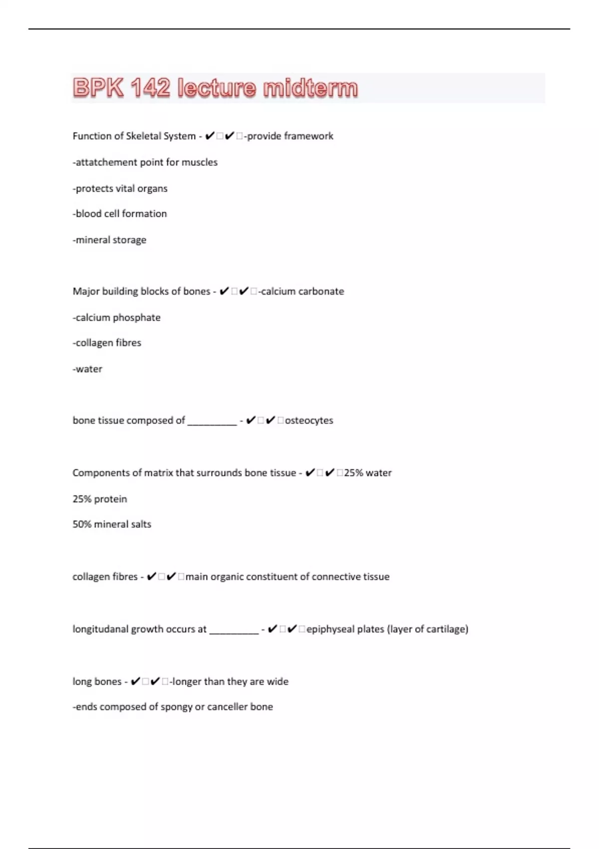 Function of Skeletal System - ️️-provide framework -attatchement point for muscles -protects vital organs -blood cell formation -mineral storage Major building blocks of bones - ️️-calcium carbonate -calcium phosphate -collagen fibres -water bone tissue composed of _________ - ️️osteocytes Components of matrix that surrounds bone tissue - ️️25% water 25% protein 50% mineral salts collagen fibres - ️️main organic constituent of connective tissue longitudanal growth occurs at _________ - ️️epiphyseal plates (layer of cartilage) long bones - ️️-longer than they are wide -ends composed of spongy or canceller bone