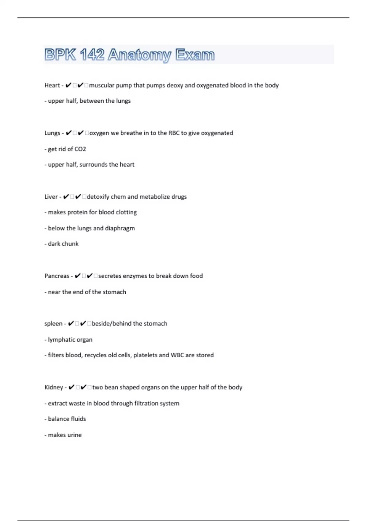 Heart - ️️muscular pump that pumps deoxy and oxygenated blood in the body - upper half, between the lungs Lungs - ️️oxygen we breathe in to the RBC to give oxygenated - get rid of CO2 - upper half, surrounds the heart Liver - ️️detoxify chem and metabolize drugs - makes protein for blood clotting - below the lungs and diaphragm - dark chunk Pancreas - ️️secretes enzymes to break down food - near the end of the stomach spleen - ️️beside/behind the stomach - lymphatic organ - filters blood, recycles old cells, platelets and WBC are stored Kidney - ️️two bean shaped organs on the upper half of the body - extract waste in blood through filtration system - balance fluids - makes urine