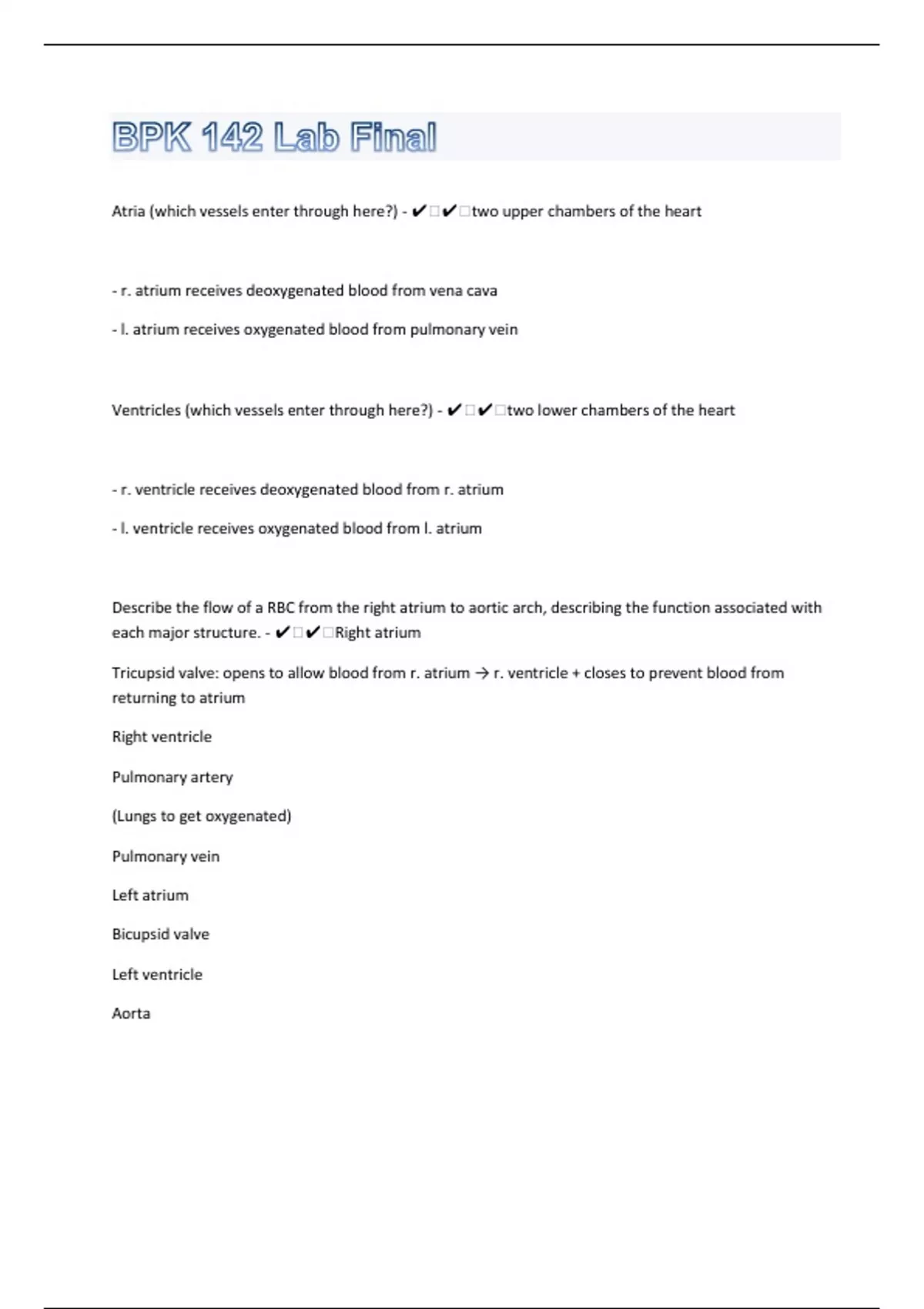 Atria (which vessels enter through here?) - ️️two upper chambers of the heart - r. atrium receives deoxygenated blood from vena cava - l. atrium receives oxygenated blood from pulmonary vein Ventricles (which vessels enter through here?) - ️️two lower chambers of the heart - r. ventricle receives deoxygenated blood from r. atrium - l. ventricle receives oxygenated blood from l. atrium Describe the flow of a RBC from the right atrium to aortic arch, describing the function associated with each major structure. - ️️Right atrium Tricupsid valve: opens to allow blood from r. atrium → r. ventricle + closes to prevent blood from returning to atrium Right ventricle Pulmonary artery (Lungs to get oxygenated) Pulmonary vein Left atrium Bicupsid valve Left ventricle Aorta