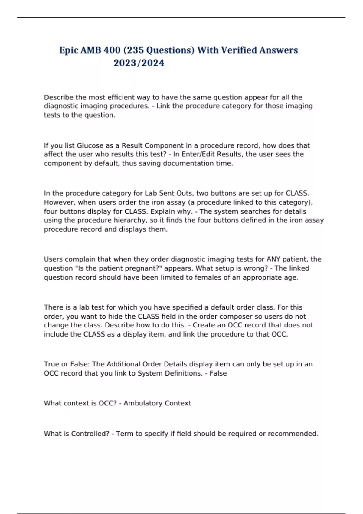 Epic AMB 400 (235 Questions) With Verified Answers 2023/2024Describe the most efficient way to have the same question appear for all the diagnostic imaging procedures. - Link the procedure category for those imaging tests to the question. If you list Glucose as a Result Component in a procedure record, how does that affect the user who results this test? - In Enter/Edit Results, the user sees the component by default, thus saving documentation time. In the procedure category for Lab Sent Outs, two buttons are set up for CLASS. However, when users order the iron assay (a procedure linked to this category), four buttons display for CLASS. Explain why. - The system searches for details using the procedure hierarchy, so it finds the four buttons defined in the iron assay procedure record and displays them. Users complain that when they order diagnostic imaging tests for ANY patient, the question "Is the patient pregnant?" appears. What setup is wrong? - The linked question record should have been limited to females of an appropriate age. There is a lab test for which you have specified a default order class. For this order, you want to hide the CLASS field in the order composer so users do not change the class. Describe how to do this. - Create an OCC record that does not include the CLASS as a display item, and link the procedure to that OCC.