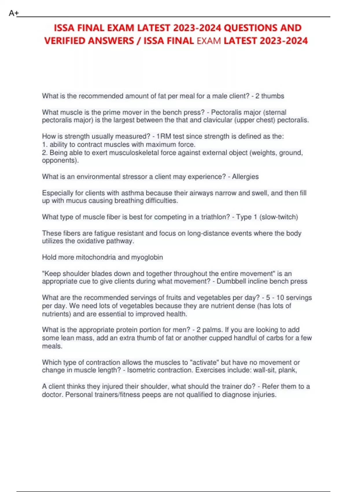 ISSA FINAL EXAM LATEST QUESTIONS AND VERIFIED ANSWERS / ISSA FINAL EXAM LATEST What is the recommended amount of fat per meal for a male client? - 2 thumbs What muscle is the prime mover in the bench press? - Pectoralis major (sternal pectoralis major) is the largest between the that and clavicular (upper chest) pectoralis. How is strength usually measured? - 1RM test since strength is defined as the: 1. ability to contract muscles with maximum force. 2. Being able to exert musculoskeletal force against external object (weights, ground, opponents). What is an environmental stressor a client may experience? - Allergies Especially for clients with asthma because their airways narrow and swell, and then fill up with mucus causing breathing difficulties. What type of muscle fiber is best for competing in a triathlon? - Type 1 (slow-twitch) These fibers are fatigue resistant and focus on long-distance events where the body utilizes the oxidative pathway. Hold more mitochondria and myoglobin "Keep shoulder blades down and together throughout the entire movement" is an appropriate cue to give clients during what movement? - Dumbbell incline bench press What are the recommended servings of fruits and vegetables per day? - 5 - 10 servings per day. We need lots of vegetables because they are nutrient dense (has lots of nutrients) and are essential to improved health. What is the appropriate protein portion for men? - 2 palms. If you are looking to add some lean mass, add an extra thumb of fat or another cupped handful of carbs for a few meals. Which type of contraction allows the muscles to "activate" but have no movement or change in muscle length? - Isometric contraction. Exercises include: wall-sit, plank, A client thinks they injured their shoulder, what should the trainer do? - Refer them to a doctor. Personal trainers/fitness peeps are not qualified to diagnose injuries. A+ ISSA FINAL EXAM LATEST QUESTIONS AND VERIFIED ANSWERS / ISSA FINAL EXAM LATEST All activities begin in which energy pathway? - ATP/CP pathway. Doesn't matter how long or how intense the activity is, every activity starts here. Myosin ATPase cuts off a phosphate molecule from ATP and uses it for releasing energy. What is the most superficial (closest to the surface) muscle of the abdominals. - External obliques Utilizing the FITT principle, how many times a week should a beginner client workout for? - 3 times a week. This principle works best for beginners because it will show them how to get started. What is responsible for sensing excessive stretch to protect the muscle? - Muscle spindle. Cycling your training to help account for shock, compensation, and exhaustion is an important part of periodization and refers to which principle? - The GAS principle. 1. "Alarm stage" applying intense training stress. 2. "Resistance stage" muscles evolve and adapt to handling heavier loads and resist stressful weights more easily and effectively. 3. "Exhaustion stage" continually adding stress will exhaust our reserves and will cease to function at peak performance. To prevent the third stage from even happening, you need weeks of going "light"; decreasing the weight and intensity to give your body time to rest and recover. The need for different phases of training helps to prevent what? - Overtraining Mix things up a bit. Don't get stuck with using the same program/workouts over and over again, which will lead to orthopedic stress. Incorporate different modes of training and experiment. A good example is cross-training, which involves performing different activities and sports to achieve a well-rounded and healthy body. Individuals with hypertension should moderate their intake of what? - Salt It has been shown to increase blood pressure in sodium-sensitive individuals. Half of hypertensive individuals are sodium-sensitive. A client performs 8 reps of the seated leg press at 320 lbs. What is their estimated 1RM? - 400 lbs Take the weight that he lifted (320 lbs) and divide that by 80% (0.80 is the percent of max) and that = 400 lbs. What would be a symptom of overtraining? - Decrease in performance A+ ISSA FINAL EXAM LATEST 2