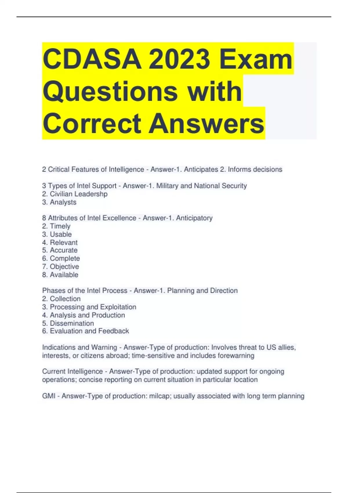 CDASA 2023 Exam Questions with Correct Answers 2 Critical Features of Intelligence - Answer-1. Anticipates 2. Informs decisions 3 Types of Intel Support - Answer-1. Military and National Security 2. Civilian Leadershp 3. Analysts 8 Attributes of Intel Excellence - Answer-1. Anticipatory 2. Timely 3. Usable 4. Relevant 5. Accurate 6. Complete 7. Objective 8. Available Phases of the Intel Process - Answer-1. Planning and Direction 2. Collection 3. Processing and Exploitation 4. Analysis and Production 5. Dissemination 6. Evaluation and Feedback Indications and Warning - Answer-Type of production: Involves threat to US allies, interests, or citizens abroad; time-sensitive and includes forewarning Current Intelligence - Answer-Type of production: updated support for ongoing operations; concise reporting on current situation in particular location GMI - Answer-Type of production: milcap; usually associated with long term planning Target Intelligence - Answer-Type of production: enemy personnel, units, disposition, facilities, systems, & nodes; selecting and prioritizing targets to satisfy objectives with appropriate response; continues as contingency planning for future ops S&TI - Answer-Type of production: foreign developments in S&T with warfare potential, R&D, overall weapons systems and equipment effectiveness; includes electronics and cyber capabilities Estimative Intelligence - Answer-Type of production: forecast unknown; use techniques like pattern analysis, inference & statistical probability; provide forecasts on how a situation may develop and implications of planning & execution of military ops DCGS - all-services ISR system - Answer-Distributed Common Groups System Collection Requirements Manager ensures: - Answer-1. Define intel needs sufficiently 2. Info doesn't already exist 3. Disciplie is appropriate 4. Appropriate for stated level Collection Plan a) can be b) must include - Answer-a) hard or soft copy and formal or automated b) statement of req'd info; assets to be tasked; add'l resources requested; timeliness of info; customer/use of final product Key Elements of Targets (definition) - Answer-Parameters of target that serve as discriminators in discipline/sensor selection Key Elements of Targets - Answer-1. Observables & Collectables (emanations/SIGINT/MASINT) 2. Range 3. Access to Target 4. Timeliness Collection Capability Factors - Answer-1. Performance characteristics (ability, quality, accuracy) 2. Range 3. Dwell Time 4. Timeliness Battlespace Factors (collection) - Answer-1. Threat 2. Weather and Light 3. Terrain 4. WMD 2 Types of Collection Requirements - Answer-1. Community-wide 2. Discipline-specific 2 parts of CCIR - Answer-1. Friendly Force Info (FFIRs) 2. PIR TPED - Answer-Tasking Processing Exploitation Dissemination