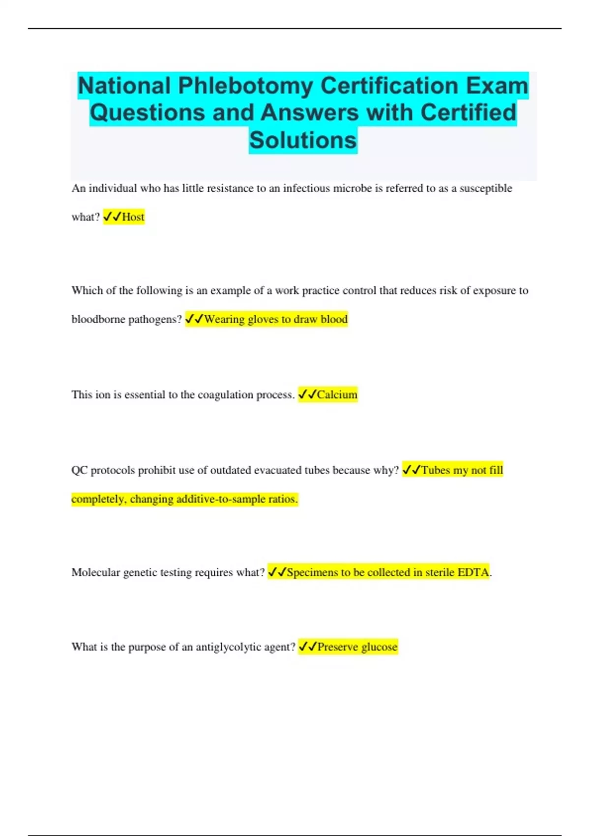 An individual who has little resistance to an infectious microbe is referred to as a susceptible what? Host Which of the following is an example of a work practice control that reduces risk of exposure to bloodborne pathogens? Wearing gloves to draw blood This ion is essential to the coagulation process. Calcium QC protocols prohibit use of outdated evacuated tubes because why? Tubes my not fill completely, changing additive-to-sample ratios. Molecular genetic testing requires what? Specimens to be collected in sterile EDTA. What is the purpose of an antiglycolytic agent? Preserve glucose