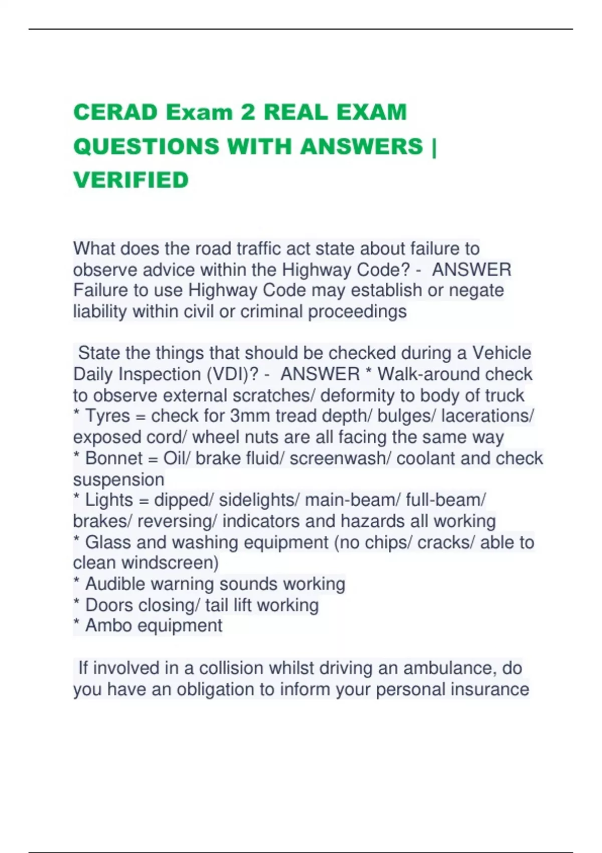 CERAD Exam 2 REAL EXAM QUESTIONS WITH ANSWERS | VERIFIED What does the road traffic act state about failure to observe advice within the Highway Code? - ANSWER Failure to use Highway Code may establish or negate liability within civil or criminal proceedings State the things that should be checked during a Vehicle Daily Inspection (VDI)? - ANSWER * Walk-around check to observe external scratches/ deformity to body of truck * Tyres = check for 3mm tread depth/ bulges/ lacerations/ exposed cord/ wheel nuts are all facing the same way * Bonnet = Oil/ brake fluid/ screenwash/ coolant and check suspension * Lights = dipped/ sidelights/ main-beam/ full-beam/ brakes/ reversing/ indicators and hazards all working * Glass and washing equipment (no chips/ cracks/ able to clean windscreen) * Audible warning sounds working * Doors closing/ tail lift working * Ambo equipment If involved in a collision whilst driving an ambulance, do you have an obligation to inform your personal insurance company? - ANSWER Yes, if you don't your insurance will be void Who has the greatest responsibility to reduce danger to others - ANSWER the person with the largest vehicle Highway Code rule 89 states that your vehicle must comply with requirements of the Road Vehicles (Construction and Use) Regulations and what else? - ANSWER Road Vehicles Lighting Regulations What is the definition of a road? - ANSWER Any highway/ road to which the public has access and includes bridges over which a road passes Who is responsible for setting penalties for road traffic offences? - ANSWER Parliament (The courts then serve the penalties) Failure to rectify vehicle defects can result in penalty points on a driving license, True or False? - ANSWER True Driving standards required by law as per road traffic act 1998... What are they? - ANSWER If a person drives a mechanically propelled vehicle without due care/ lack of consideration for other people, he is guilty of offence Those found guilty of death by dangerous driving will be given a custodial sentence no matter the mitigating factors, true or false? - ANSWER True How many penalty points can a driver accumulate within a 3 year period before they get disqualified from dangerous driving? - ANSWER 12 points What's the correct order fro a pre-driver check? - ANSWER 1. Handbrake and gear 2. Seat adjustment and steering wheel 3. Mirrors 4. Perform starting procedure How many penalty points can be given for each vehicle defect identified - ANSWER 3 per defect