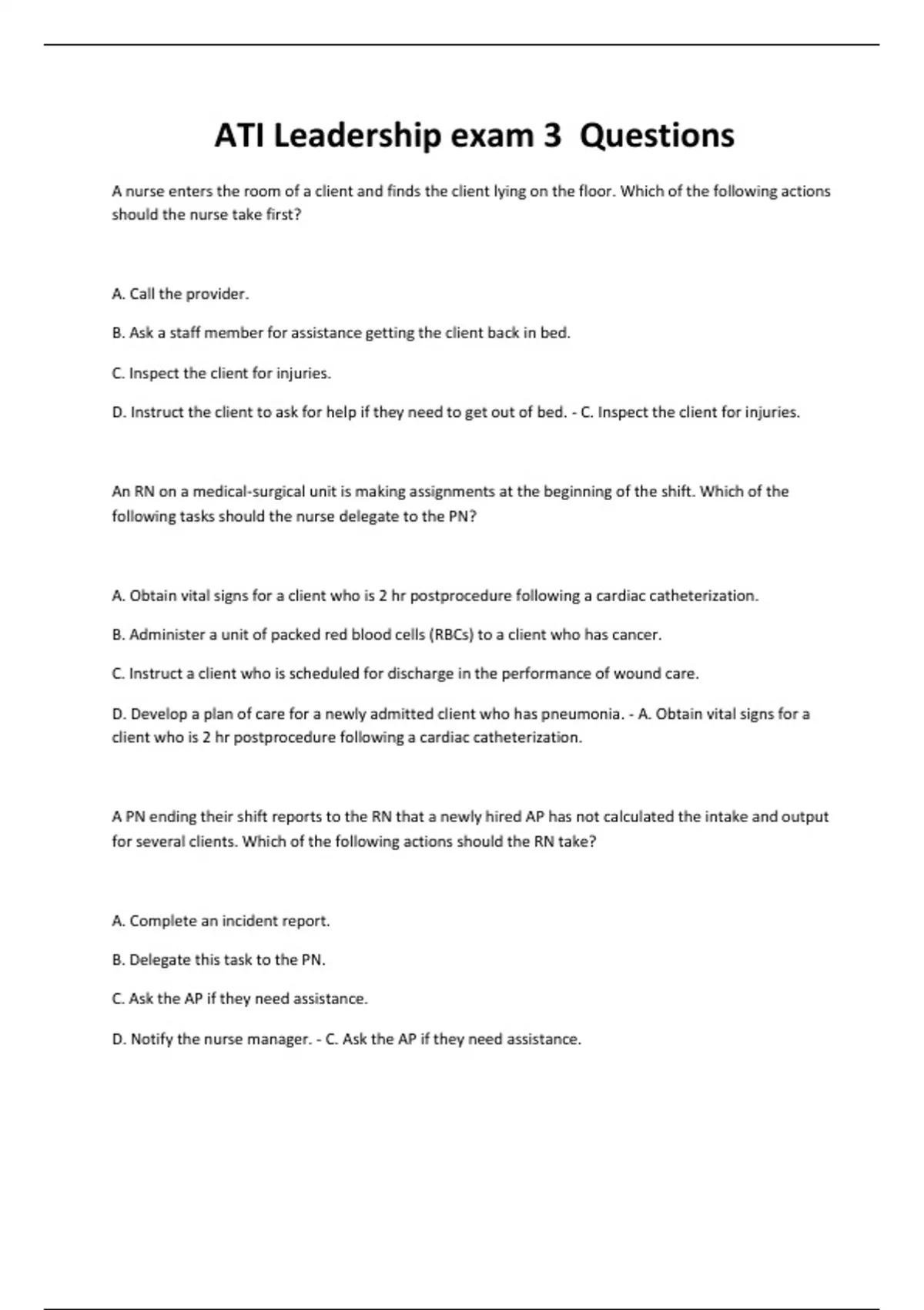 A nurse enters the room of a client and finds the client lying on the floor. Which of the following actions should the nurse take first? A. Call the provider. B. Ask a staff member for assistance getting the client back in bed. C. Inspect the client for injuries. D. Instruct the client to ask for help if they need to get out of bed. - C. Inspect the client for injuries. An RN on a medical‑surgical unit is making assignments at the beginning of the shift. Which of the following tasks should the nurse delegate to the PN? A. Obtain vital signs for a client who is 2 hr postprocedure following a cardiac catheterization. B. Administer a unit of packed red blood cells (RBCs) to a client who has cancer. C. Instruct a client who is scheduled for discharge in the performance of wound care. D. Develop a plan of care for a newly admitted client who has pneumonia. - A. Obtain vital signs for a client who is 2 hr postprocedure following a cardiac catheterization. A PN ending their shift reports to the RN that a newly hired AP has not calculated the intake and output for several clients. Which of the following actions should the RN take? A. Complete an incident report. B. Delegate this task to the PN. C. Ask the AP if they need assistance. D. Notify the nurse manager. - C. Ask the AP if they need assistance.