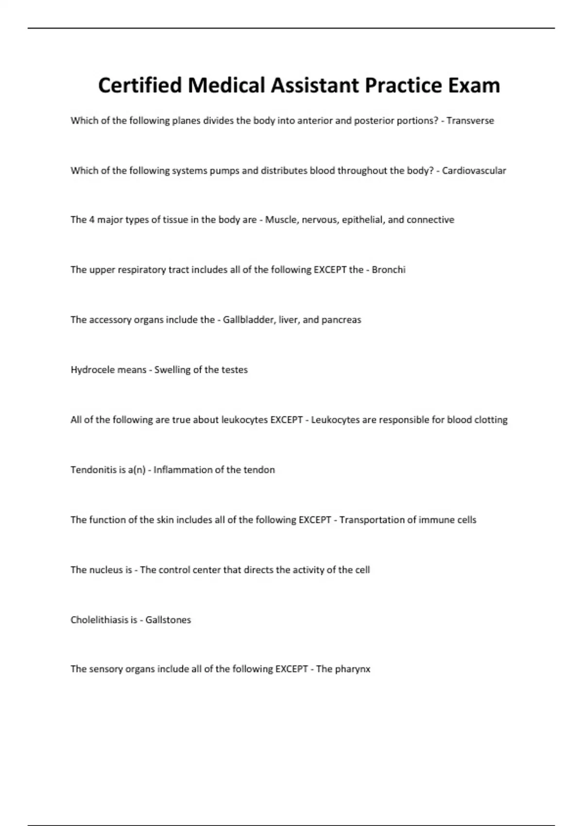 Which of the following planes divides the body into anterior and posterior portions? - Transverse Which of the following systems pumps and distributes blood throughout the body? - Cardiovascular The 4 major types of tissue in the body are - Muscle, nervous, epithelial, and connective The upper respiratory tract includes all of the following EXCEPT the - Bronchi The accessory organs include the - Gallbladder, liver, and pancreas Hydrocele means - Swelling of the testes All of the following are true about leukocytes EXCEPT - Leukocytes are responsible for blood clotting Tendonitis is a(n) - Inflammation of the tendon The function of the skin includes all of the following EXCEPT - Transportation of immune cells The nucleus is - The control center that directs the activity of the cell Cholelithiasis is - Gallstones The sensory organs include all of the following EXCEPT - The pharynx Which of the following terms means "the surgical removal of the kidney"? - Nephrectomy The combing form cost/o refers to which of the following anatomic structures? - Rib All of the following compoents are a part of the Sigmund Freud's theories of psychology EXCEPT - Behaviorism Which of the following terms means "difficulty swallowing"? - Dsyphagia Cognitive theory offers an approach to psychology that encourages individuals to examine - Errors in their thinking Which suffix means " surgical repair"? - Plasty