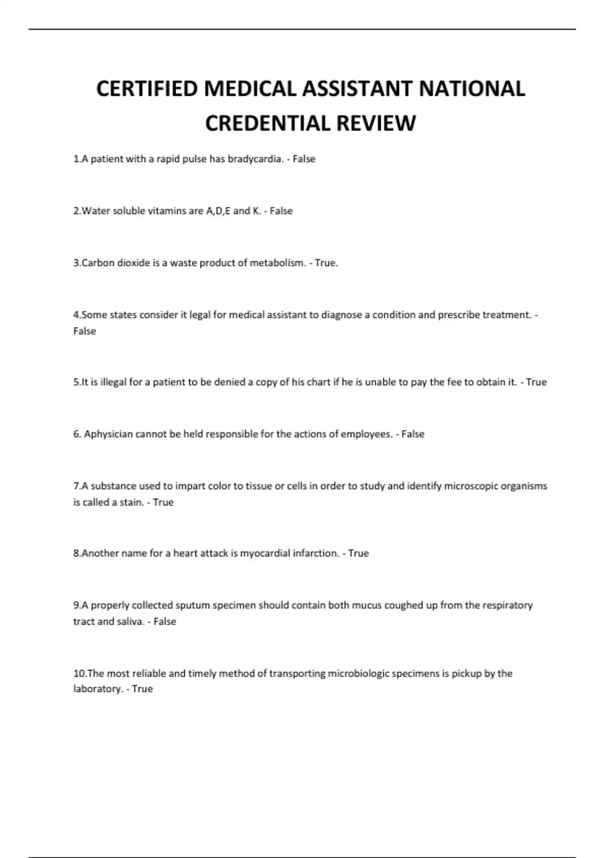 1.A patient with a rapid pulse has bradycardia. - False 2.Water soluble vitamins are A,D,E and K. - False 3.Carbon dioxide is a waste product of metabolism. - True. 4.Some states consider it legal for medical assistant to diagnose a condition and prescribe treatment. - False 5.It is illegal for a patient to be denied a copy of his chart if he is unable to pay the fee to obtain it. - True 6. Aphysician cannot be held responsible for the actions of employees. - False 7.A substance used to impart color to tissue or cells in order to study and identify microscopic organisms is called a stain. - True 8.Another name for a heart attack is myocardial infarction. - True 9.A properly collected sputum specimen should contain both mucus coughed up from the respiratory tract and saliva. - False 10.The most reliable and timely method of transporting microbiologic specimens is pickup by the laboratory. - True Hepat stands for root of kidney - False 12. A medical assistant needs additional training to be able to perform microbiologic tests, such as sensitivity tests, and to interpret cultures of specimens. - True 13.Viruses are found in soil. - True 14. The process of blood cells clumping together to form a clot is coagulation. - True 15.Water contributes about 60% of body weight. - True 16.The lowest level of organization for the human body begins at the chemical level. - True