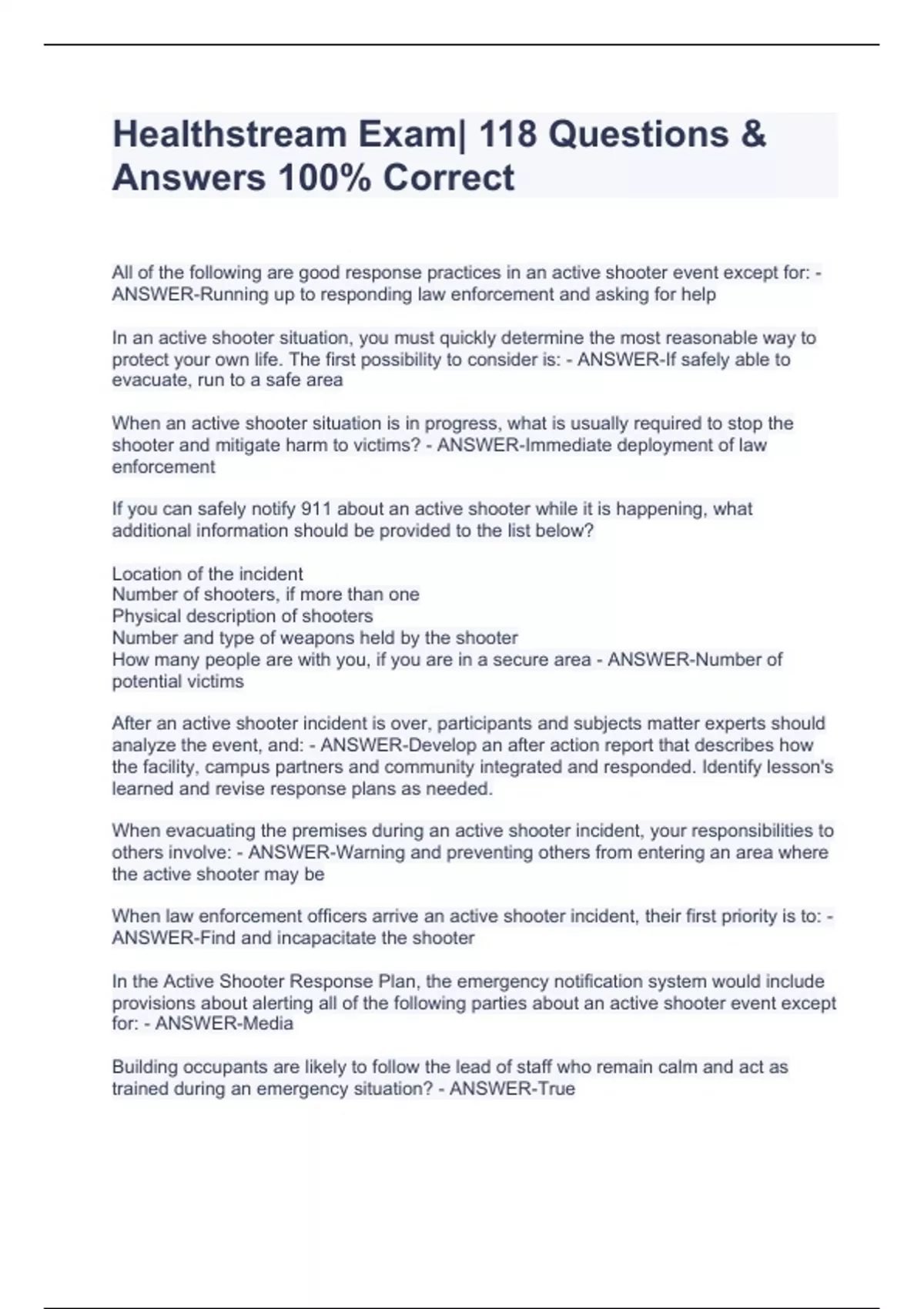 In an active shooter situation, you must quickly determine the most reasonable way to protect your own life. The first possibility to consider is: - ANSWER-If safely able to evacuate, run to a safe area When an active shooter situation is in progress, what is usually required to stop the shooter and mitigate harm to victims? - ANSWER-Immediate deployment of law enforcement If you can safely notify 911 about an active shooter while it is happening, what additional information should be provided to the list below? Location of the incident Number of shooters, if more than one Physical description of shooters Number and type of weapons held by the shooter How many people are with you, if you are in a secure area - ANSWER-Number of potential victims After an active shooter incident is over, participants and subjects matter experts should analyze the event, and: - ANSWER-Develop an after action report that describes how the facility, campus partners and community integrated and responded. Identify lesson's learned and revise response plans as needed. When evacuating the premises during an active shooter incident, your responsibilities to others involve: - ANSWER-Warning and preventing others from entering an area where the active shooter may be When law enforcement officers arrive an active shooter incident, their first priority is to: - ANSWER-Find and incapacitate the shooter In the Active Shooter Response Plan, the emergency notification system would include provisions about alerting all of the following parties about an active shooter event except for: - ANSWER-Media Building occupants are likely to follow the lead of staff who remain calm and act as trained during an emergency situation? - ANSWER-True