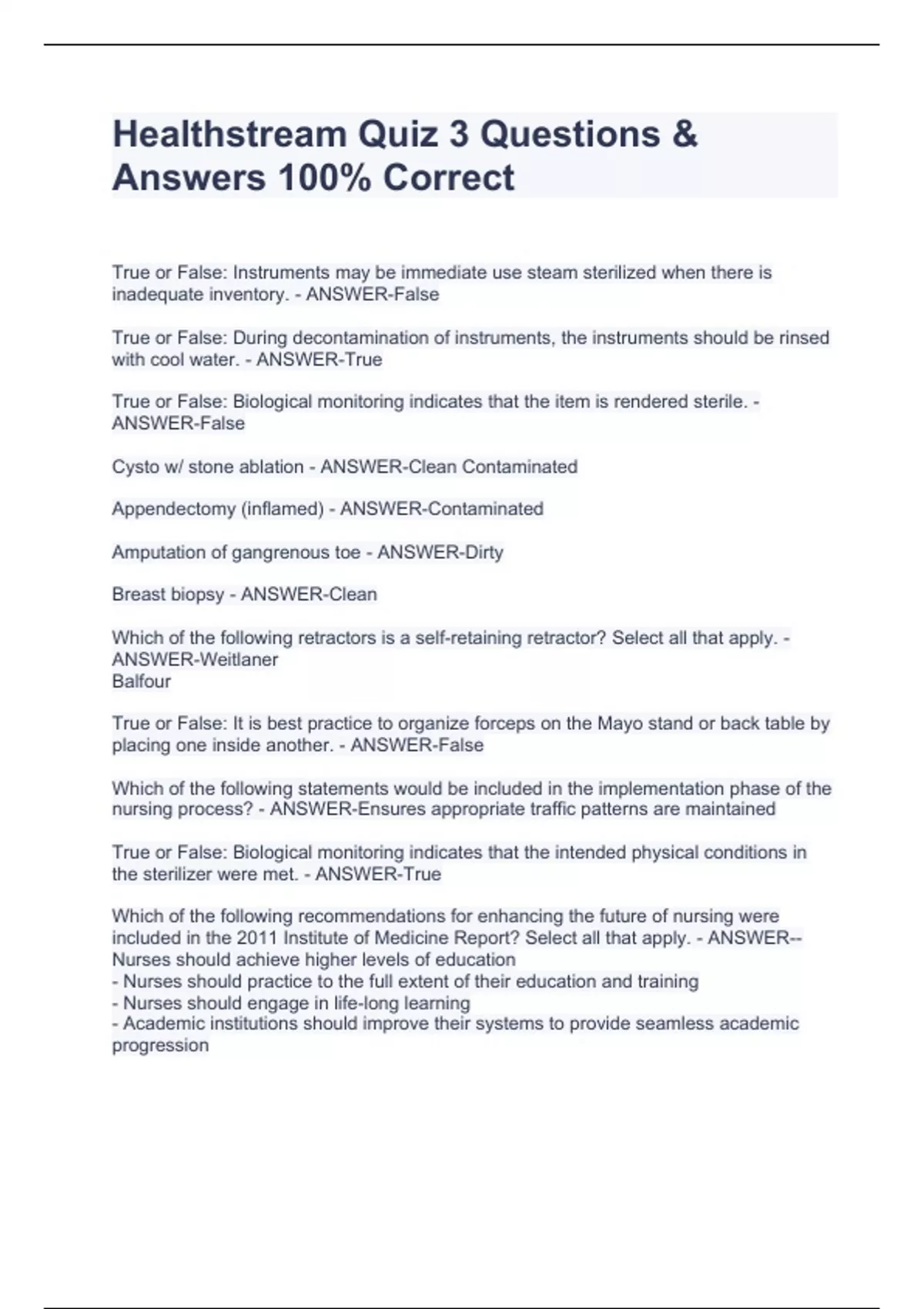 True or False: Instruments may be immediate use steam sterilized when there is inadequate inventory. - ANSWER-False True or False: During decontamination of instruments, the instruments should be rinsed with cool water. - ANSWER-True True or False: Biological monitoring indicates that the item is rendered sterile. - ANSWER-False Cysto w/ stone ablation - ANSWER-Clean Contaminated Appendectomy (inflamed) - ANSWER-Contaminated Amputation of gangrenous toe - ANSWER-Dirty Breast biopsy - ANSWER-Clean Which of the following retractors is a self-retaining retractor? Select all that apply. - ANSWER-Weitlaner Balfour True or False: It is best practice to organize forceps on the Mayo stand or back table by placing one inside another. - ANSWER-False Which of the following statements would be included in the implementation phase of the nursing process? - ANSWER-Ensures appropriate traffic patterns are maintained True or False: Biological monitoring indicates that the intended physical conditions in the sterilizer were met. - ANSWER-True Which of the following recommendations for enhancing the future of nursing were included in the 2011 Institute of Medicine Report? Select all that apply. - ANSWER-- Nurses should achieve higher levels of education - Nurses should practice to the full extent of their education and training - Nurses should engage in life-long learning - Academic institutions should improve their systems to provide seamless academic progression