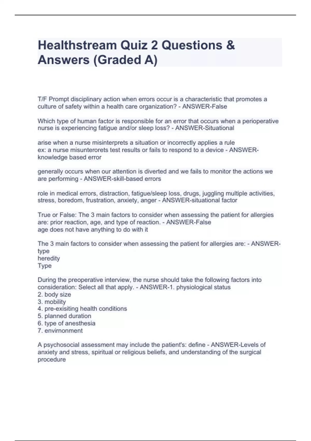 Which type of human factor is responsible for an error that occurs when a perioperative nurse is experiencing fatigue and/or sleep loss? - ANSWER-Situational arise when a nurse misinterprets a situation or incorrectly applies a rule ex: a nurse misunterorets test results or fails to respond to a device - ANSWER-knowledge based error generally occurs when our attention is diverted and we fails to monitor the actions we are performing - ANSWER-skill-based errors role in medical errors, distraction, fatigue/sleep loss, drugs, juggling multiple activities, stress, boredom, frustration, anxiety, anger - ANSWER-situational factor True or False: The 3 main factors to consider when assessing the patient for allergies are: prior reaction, age, and type of reaction. - ANSWER-False age does not have anything to do with it The 3 main factors to consider when assessing the patient for allergies are: - ANSWER-type heredity Type During the preoperative interview, the nurse should take the following factors into consideration: Select all that apply. - ANSWER-1. physiological status 2. body size 3. mobility 4. pre-exisiting health conditions 5. planned duration 6. type of anesthesia 7. envirnonment