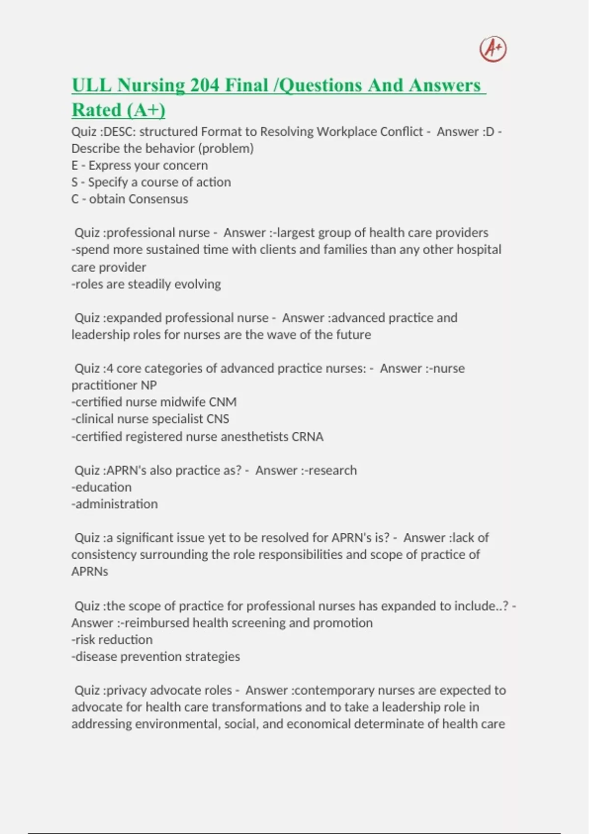 ULL Nursing 204 Final /Questions And Answers Rated (A+)