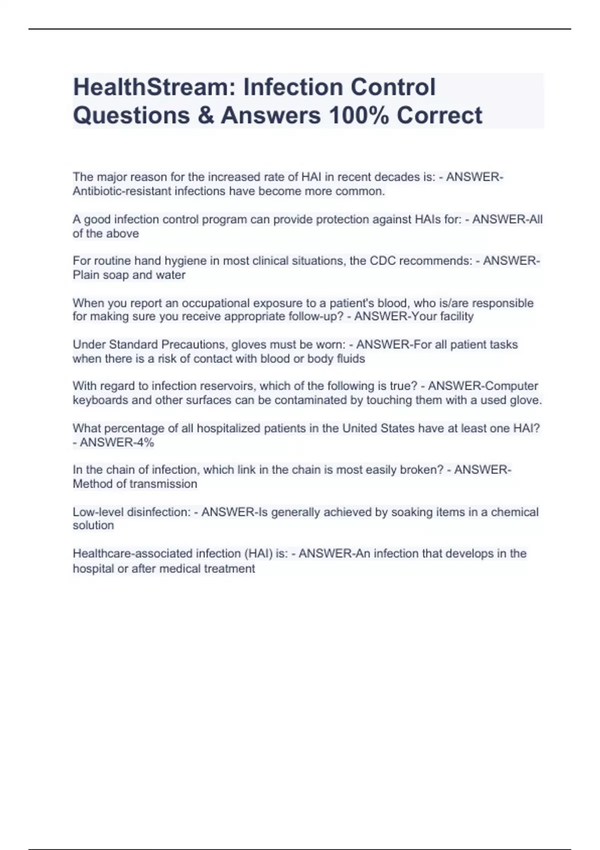 HealthStream: Infection Control Questions & Answers 100% Correct