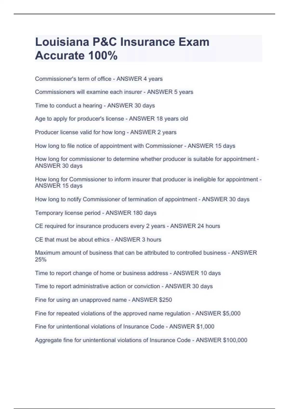 Commissioner's term of office - ANSWER 4 years Commissioners will examine each insurer - ANSWER 5 years Time to conduct a hearing - ANSWER 30 days Age to apply for producer's license - ANSWER 18 years old Producer license valid for how long - ANSWER 2 years How long to file notice of appointment with Commissioner - ANSWER 15 days How long for commissioner to determine whether producer is suitable for appointment - ANSWER 30 days How long for Commissioner to inform insurer that producer is ineligible for appointment - ANSWER 15 days How long to notify Commissioner of termination of appointment - ANSWER 30 days Temporary license period - ANSWER 180 days CE required for insurance producers every 2 years - ANSWER 24 hours CE that must be about ethics - ANSWER 3 hours