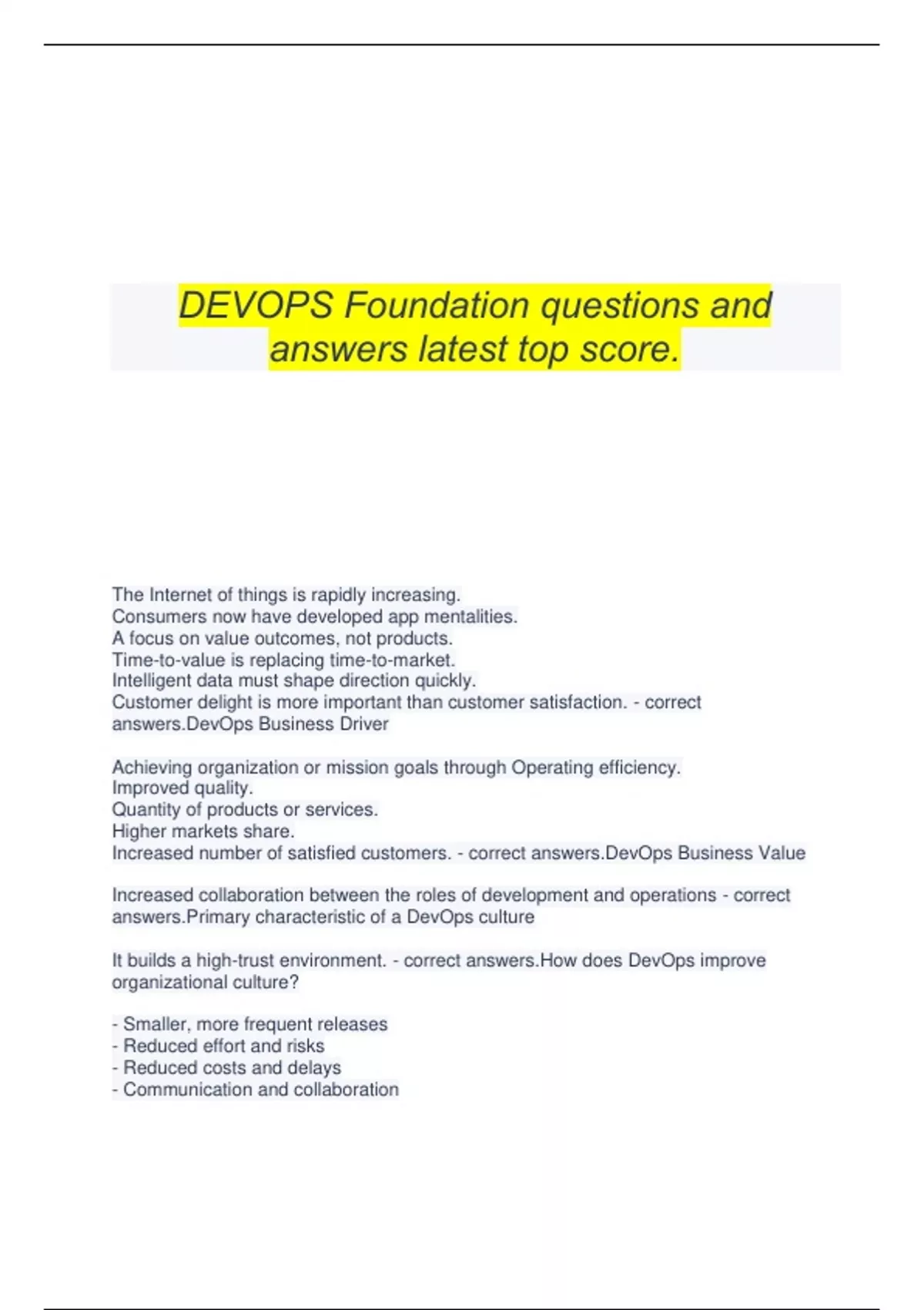 DEVOPS Foundation questions and answers latest top score. The Internet of things is rapidly increasing. Consumers now have developed app mentalities. A focus on value outcomes, not products. Time-to-value is replacing time-to-market. Intelligent data must shape direction quickly. Customer delight is more important than customer satisfaction. - correct answers.DevOps Business Driver Achieving organization or mission goals through Operating efficiency. Improved quality. Quantity of products or services. Higher markets share. Increased number of satisfied customers. - correct answers.DevOps Business Value Increased collaboration between the roles of development and operations - correct answers.Primary characteristic of a DevOps culture It builds a high-trust environment. - correct answers.How does DevOps improve organizational culture? - Smaller, more frequent releases - Reduced effort and risks - Reduced costs and delays - Communication and collaboration - Consistency & speed through automation - correct answers.DevOps goals - more frequent deployments - faster lead time from commit to deploy - faster time to recover from incident - lower change failure rate - correct answers.High performance organization have Celebrate successes. Communicate the "big picture". Explain the reason for this change. Show how changes are connected. Tie changes to business strategies and goals. Create visible feedback and improvement loops. Empower people to contribute. Ensure each change initiative has an intended outcome. View resistance to change as normal: listen and empathize. - correct answers.Action can help avoid change fatigue • Shared vision, goals and incentives • Open, honest, two-way communication • Collaboration • Pride of workmanship • Respect • Trust • Transparency • Continuous improvement • Experimentation • Intelligent risk taking • Learning and practicing • Data-driven • Safe • Reflection • Recognition - correct answers.CHARACTERISTICS OF A DevOps CULTURE Approach: Assertive and Uncooperative Result: Win/Lose - correct answers.Competing Approach: Partially Assertive and Cooperative Result: Each Wins and Loses - correct answers.Compromising Approach: Assertive and Cooperative Result: Win/Win - correct answers.Collaborating Approach: Unassertive and Uncooperative Result: Lose/Lose - correct answers.Avoiding