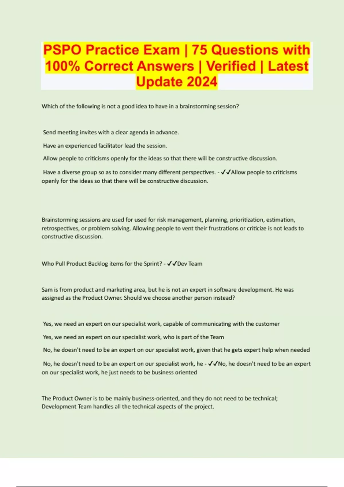 PSPO Practice Exam | 75 Questions with 100% Correct Answers | Verified | Latest Update 2024