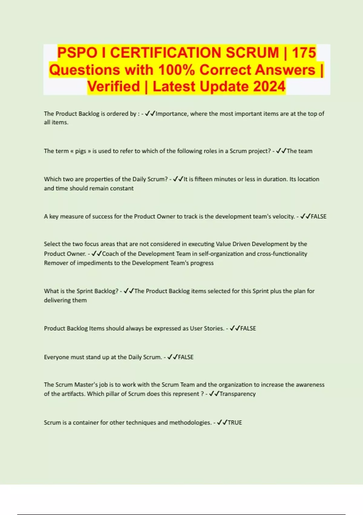 PSPO I CERTIFICATION SCRUM | 175 Questions with 100% Correct Answers | Verified | Latest Update 2024