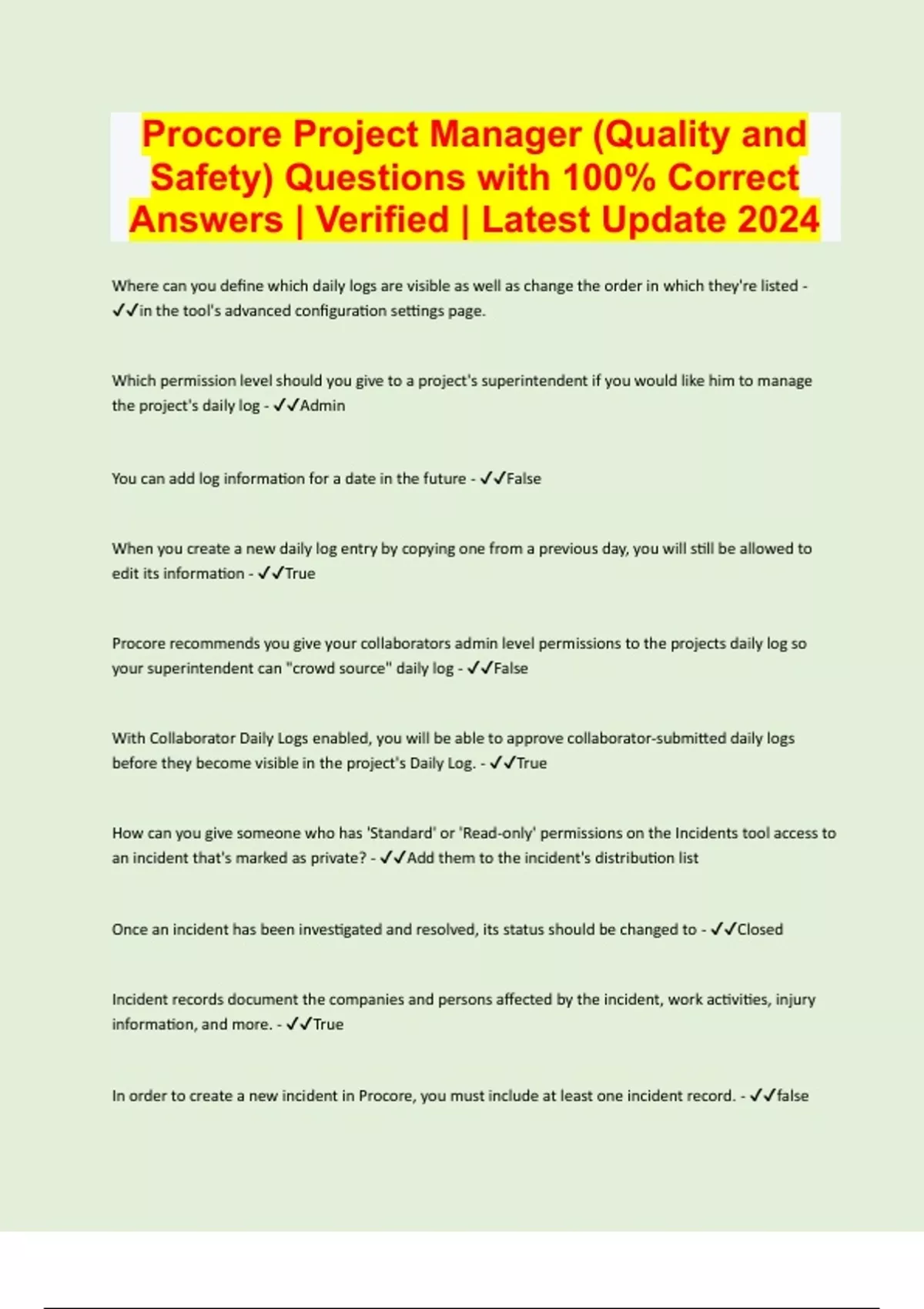 Procore Project Manager (Quality and Safety) Questions with 100% Correct Answers | Verified | Latest Update 2024