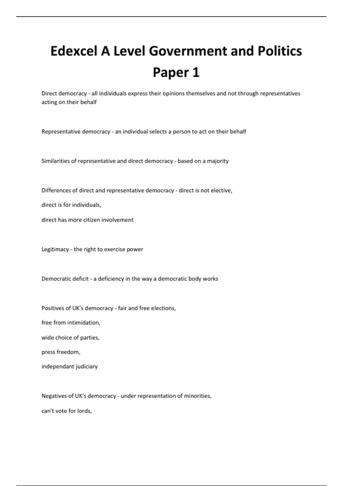 Direct democracy - all individuals express their opinions themselves and not through representatives acting on their behalf Representative democracy - an individual selects a person to act on their behalf Similarities of representative and direct democracy - based on a majority Differences of direct and representative democracy - direct is not elective, direct is for individuals, direct has more citizen involvement Legitimacy - the right to exercise power Democratic deficit - a deficiency in the way a democratic body works Positives of UK's democracy - fair and free elections, free from intimidation, wide choice of parties, press freedom, independant judiciary Negatives of UK's democracy - under representation of minorities, can't vote for lords, doesn't protect rights press is owned by millionaires Examples of declining participation - 2001 turnout was lowest since WWII (59.4%), conservative party has lost members (124,000 members in 2018) Examples of rising participation - labour biggest party in europe (552,000 members), turnout rising (68.6% 2017), e-democracy Franchise / suffrage - the ability to vote in public elections Pluralism - lots of people have a say Elitism - only a select few have a say To be able to vote you must: - be 18+, be a registered british/irish citizen To be able to vote you cannot: - be under 18, be a member of the house of lords, be convicted of illegal electoral practise, detained in a psychiatric hospital Great reform act 1832 - created 67 new constituencies, included small land owners, tenant farmers and shopkeepers in the property qualification and gave the vote to all householders who paid a yearly rent of £10+ Representation of the people act 1918 - allowed men 21+ (with/without property) and women 30+ who live in the constituency or owned land worth £5+ to vote Representation of the people act 1928 - gave women electoral equality (21+ with/without property) Representation of the people act 1948 - abolished plural voting (2 separate uni votes) and increased MP's to 613 Representation of the people act 1969 - voting age reduced to 18 to reflect change in view on adulthood For lowering voting age to 16: - already trusted with legal rights (leave school, work, army), have to learn about politics in school, voting earlier increases chance of involvement, affects their future Against lowering voting age to 16: - some lack maturity, may be influenced by parents, scottish referendum isn't fair because it had an unusually high turnout, only a few countries allow 16 year olds to vote Electoral Reform Society - longest standing pro democracy organization (1884), formed to provide better democracy where everyone votes and is treated equally, works with activists and politicians Electoral reform society campaigns - elected house of lords, votes at 16, local democracy, replace FPTP with STV Votes at 16 - formed in january 2003, want the voting age lowered to 16 as it affects young people's future Pressure group - an organised group that seeks to influence government policy or legislation Pluralism - the recognition and affirmation of diversity within a political body which permits the peaceful coexistence of different interests, convictions and lifestyles Pressure group features: - want to influence policy, usually single issue, more of them, represent an issue that isn't supported by the wider public Political parties features: - want to make policy and run the country, aim to win power, few parties, have a wide range of policies to accommodate a wide range of views, create laws Sectional pressure groups - a specific group that promotes the interest of an occupation or group in society