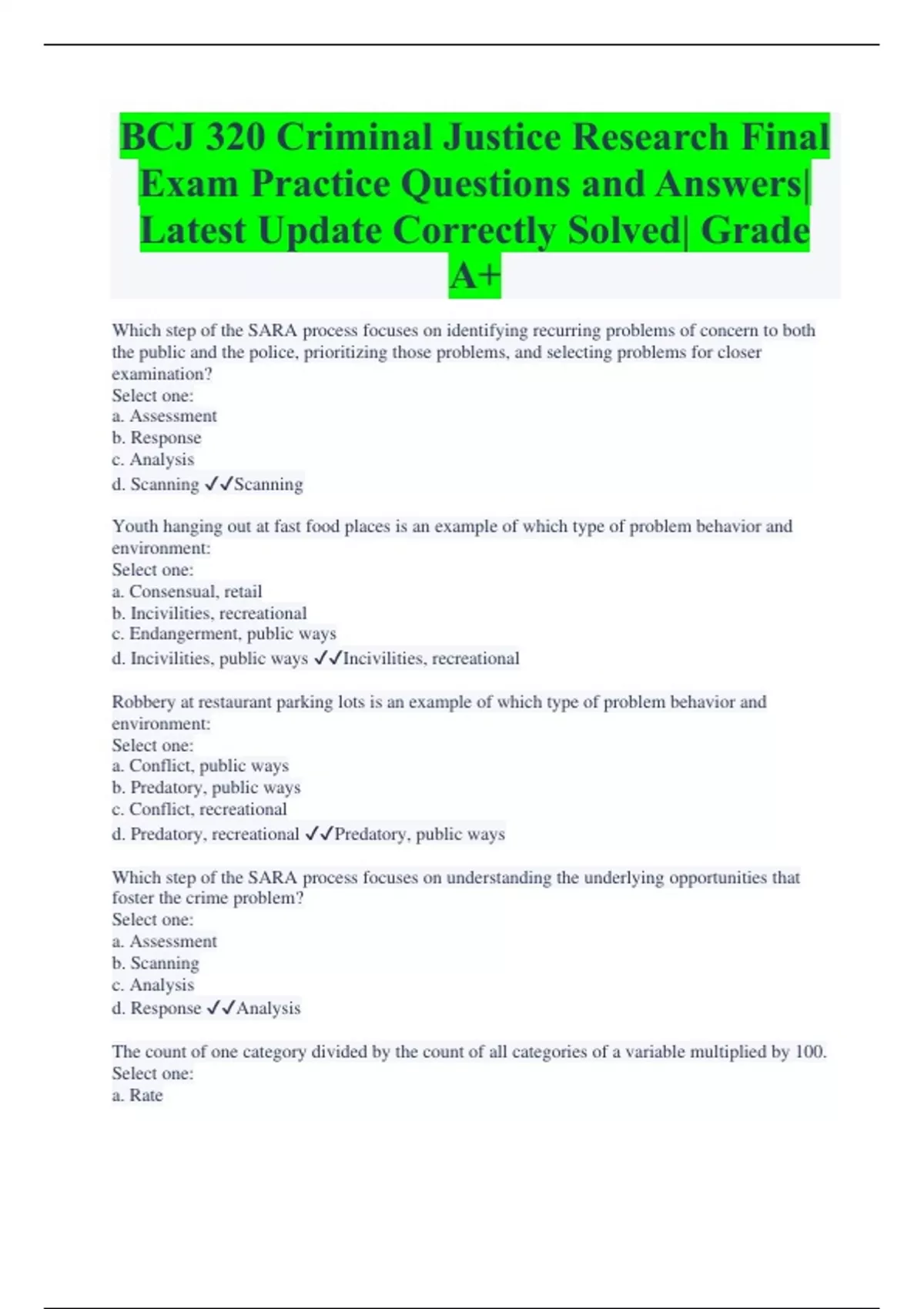 BCJ 320 Criminal Justice Research Final Exam Practice Questions and Answers| Latest Update Correctly Solved| Grade A+ Which step of the SARA process focuses on identifying recurring problems of concern to both the public and the police, prioritizing those problems, and selecting problems for closer examination? Select one: a. Assessment b. Response c. Analysis d. Scanning Scanning Youth hanging out at fast food places is an example of which type of problem behavior and environment: Select one: a. Consensual, retail b. Incivilities, recreational c. Endangerment, public ways d. Incivilities, public ways Incivilities, recreational Robbery at restaurant parking lots is an example of which type of problem behavior and environment: Select one: a. Conflict, public ways b. Predatory, public ways c. Conflict, recreational d. Predatory, recreational Predatory, public ways