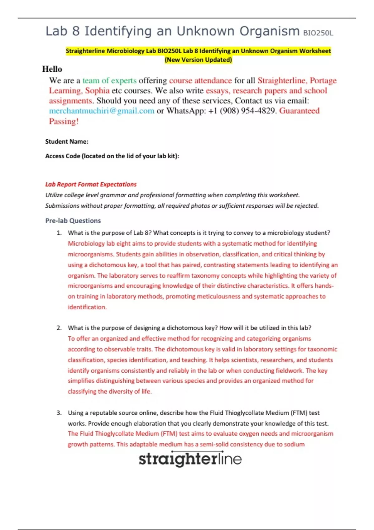 Straighterline Microbiology Lab BIO250L Lab 8 Identifying an Unknown Organism Worksheet (New Version Updated)