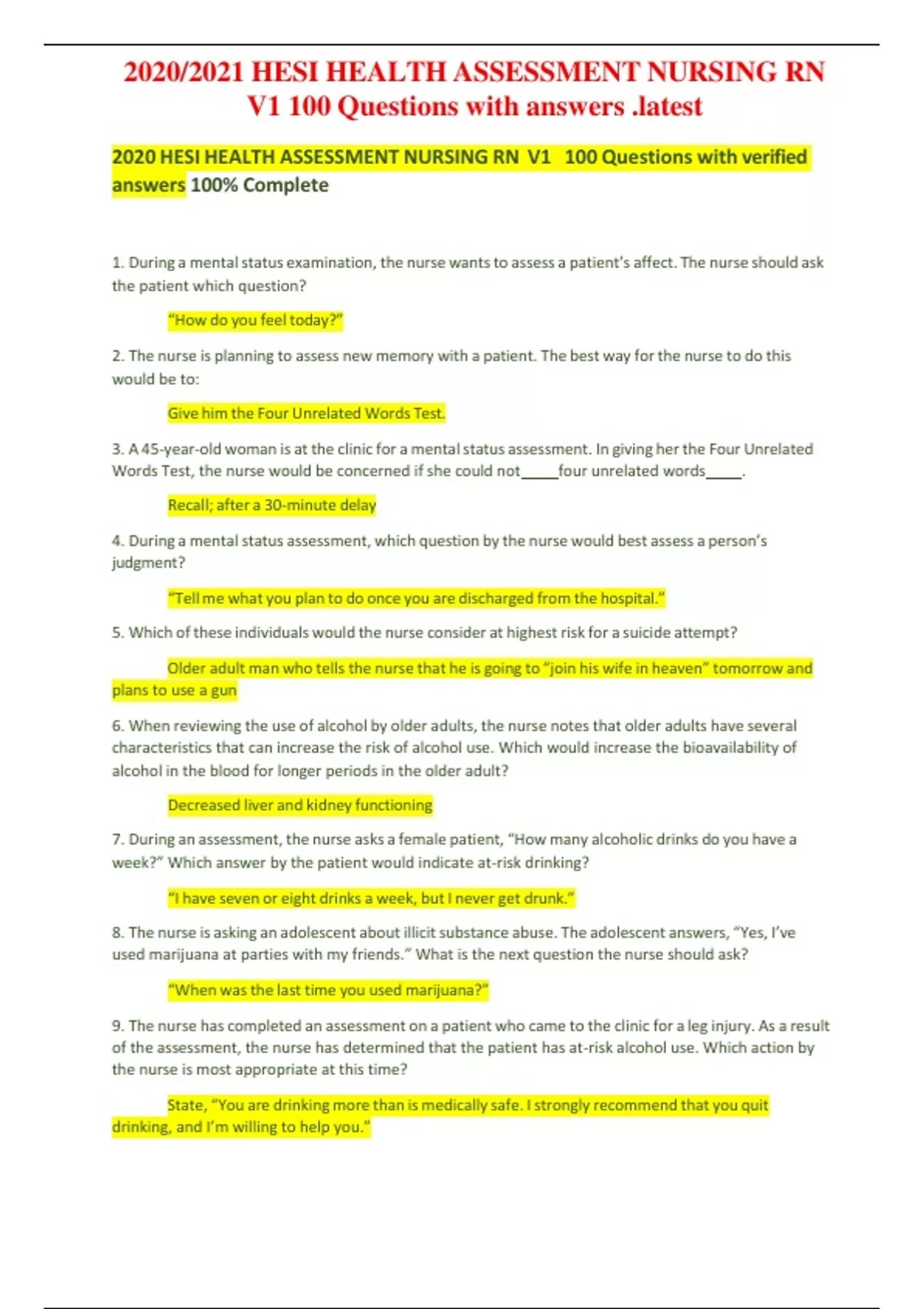 HESI HEALTH ASSESSMENT NURSING RN V1 100 Questions with answers .latest HESI HEALTH ASSESSMENT NURSING RN V1 100 Questions with verified answers 100% Complete 1. During a mentalstatus examination, the nurse wantsto assess a patient’s affect. The nurse should ask the patient which question? “How do you feel today?” 2. The nurse is planning to assess new memory with a patient. The best way forthe nurse to do this would be to: Give him the Four Unrelated Words Test. 3. A 45-year-old woman is at the clinic for a mentalstatus assessment. In giving her the Four Unrelated Words Test, the nurse would be concerned if she could not four unrelated words . Recall; after a 30-minute delay 4. During a mentalstatus assessment, which question by the nurse would best assess a person’s judgment? “Tellme what you plan to do once you are discharged from the hospital.” 5. Which of these individuals would the nurse consider at highest risk for a suicide attempt? Older adult man who tells the nurse that he is going to “join his wife in heaven” tomorrow and plans to use a gun 6. When reviewing the use of alcohol by older adults, the nurse notes that older adults have several characteristics that can increase the risk of alcohol use. Which would increase the bioavailability of alcohol in the blood for longer periods in the older adult? Decreased liver and kidney functioning 7. During an assessment, the nurse asks a female patient, “How many alcoholic drinks do you have a week?” Which answer by the patient would indicate at-risk drinking? “I have seven or eight drinks a week, but I never get drunk.” 8. The nurse is asking an adolescent about illicitsubstance abuse. The adolescent answers, “Yes, I’ve used marijuana at parties with my friends.” What is the next question the nurse should ask? “When was the last time you used marijuana?” 9. The nurse has completed an assessment on a patient who came to the clinic for a leg injury. As a result of the assessment, the nurse has determined that the patient has at-risk alcohol use. Which action by the nurse is most appropriate at this time? State, “You are drinking more than is medically safe. Istrongly recommend that you quit drinking, and I’m willing to help you.” 2020/2021 HESI HEALTH ASSESSMENT NURSING RN V1 100 Questions with answers .latest 10. A patient is brought to the emergency department. He is restless, has dilated pupils, is sweating, has a runny nose and tearing eyes, and complains of muscle and joint pains. His girlfriend thinks he has influenza, but she became concerned when his temperature went up to 39.4° C. She admits that he has been a heavy drug user, but he has been trying to stop on his own. The nurse suspects that the patient is experiencing withdrawal symptoms from which su