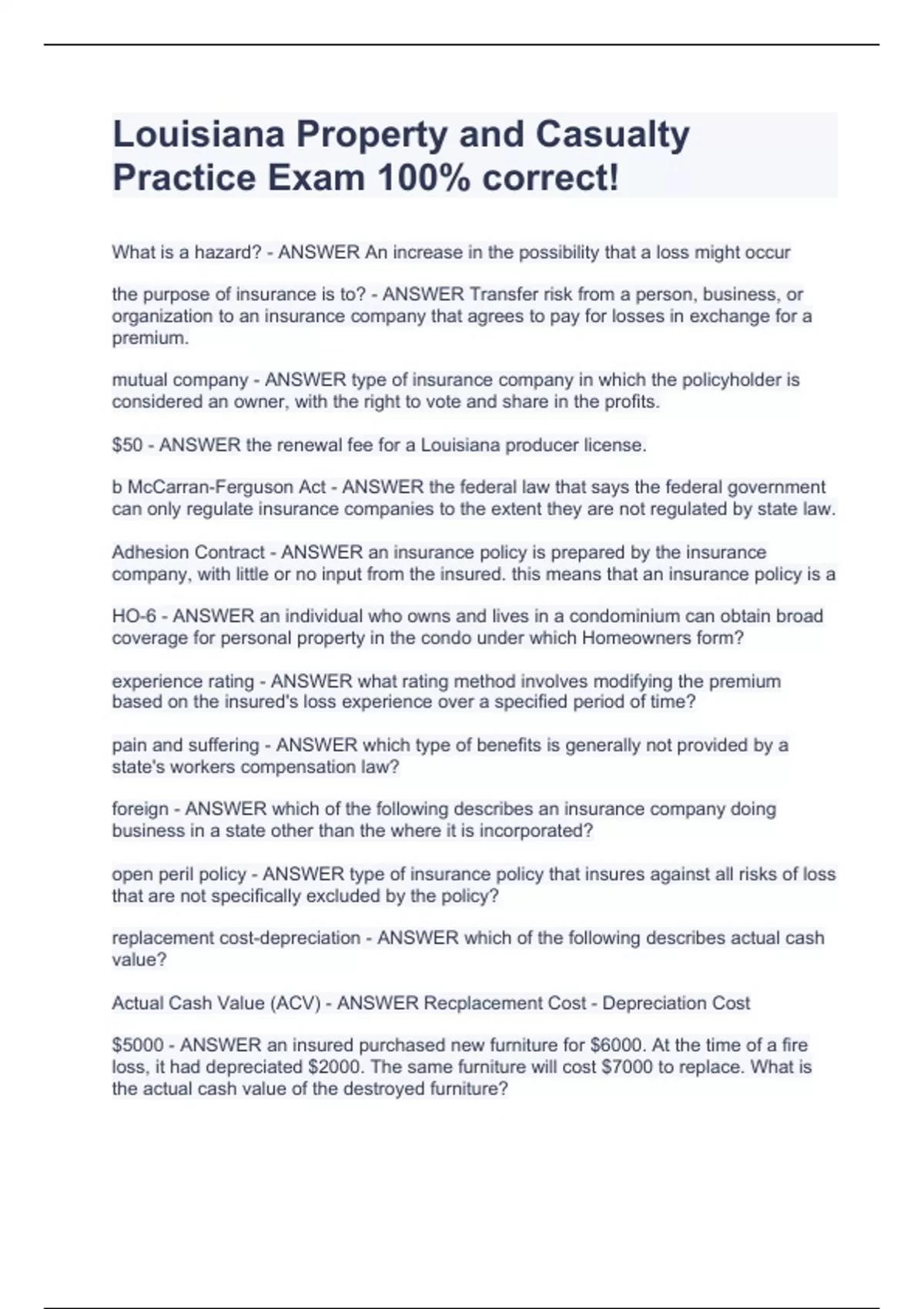 Louisiana Property and Casualty Practice Exam 100% correct! What is a hazard? - ANSWER An increase in the possibility that a loss might occur the purpose of insurance is to? - ANSWER Transfer risk from a person, business, or organization to an insurance company that agrees to pay for losses in exchange for a premium. mutual company - ANSWER type of insurance company in which the policyholder is considered an owner, with the right to vote and share in the profits. $50 - ANSWER the renewal fee for a Louisiana producer license. b McCarran-Ferguson Act - ANSWER the federal law that says the federal government can only regulate insurance companies to the extent they are not regulated by state law. Adhesion Contract - ANSWER an insurance policy is prepared by the insurance company, with little or no input from the insured. this means that an insurance policy is a HO-6 - ANSWER an individual who owns and lives in a condominium can obtain broad coverage