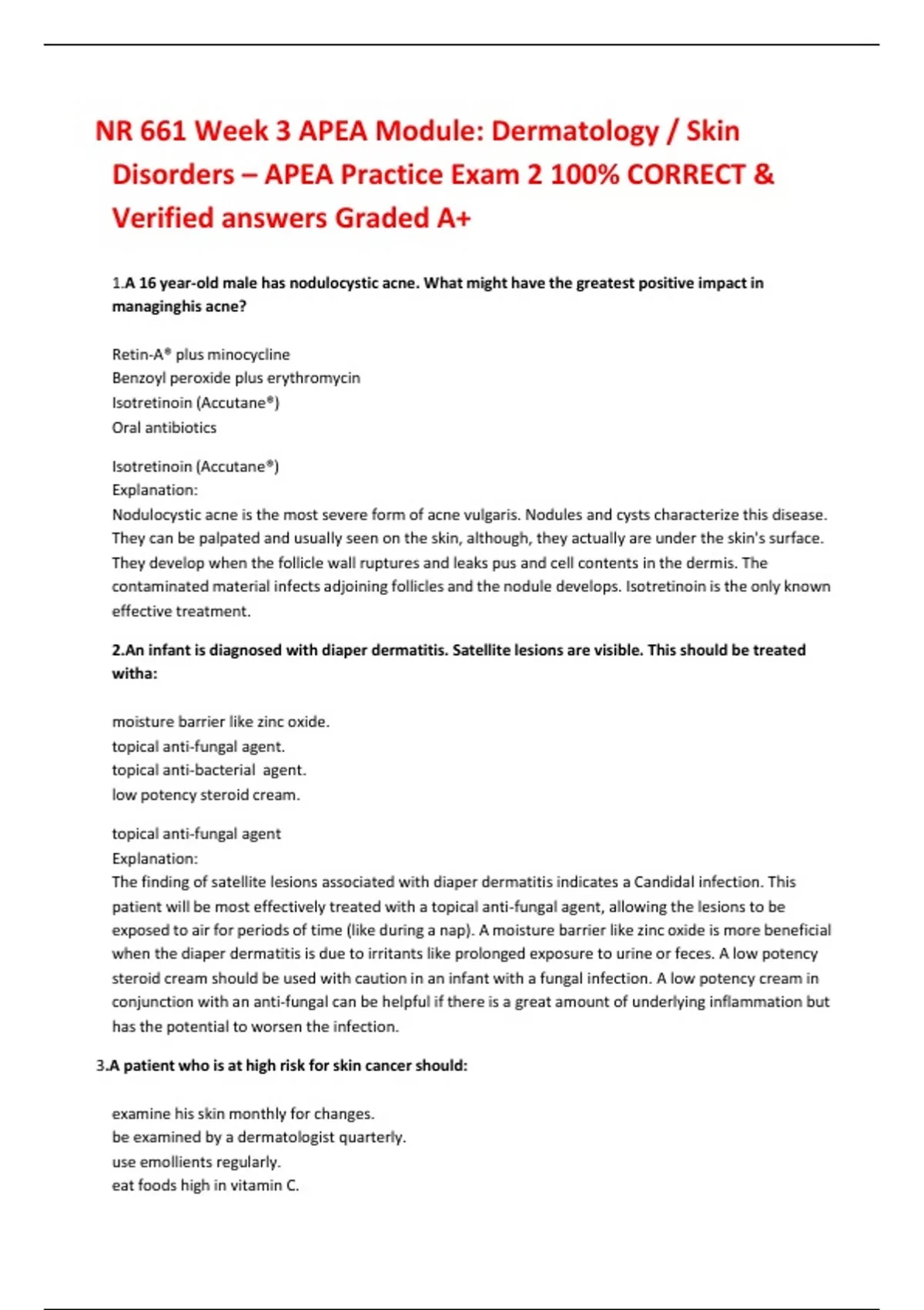 NR 661 Week 3 APEA Module: Dermatology / Skin Disorders – APEA Practice Exam 2 100% CORRECT & Verified answers Graded A+ 1.A 16 year-old male has nodulocystic acne. What might have the greatest positive impact in managinghis acne? Retin-A® plus minocycline Benzoyl peroxide plus erythromycin Isotretinoin (Accutane®) Oral antibiotics Isotretinoin (Accutane®) Explanation: Nodulocystic acne is the most severe form of acne vulgaris. Nodules and cysts characterize this disease. They can be palpated and usually seen on the skin, although, they actually are under the skin's surface. They develop when the follicle wall ruptures and leaks pus and cell contents in the dermis. The contaminated material infects adjoining follicles and the nodule develops. Isotretinoin is the only known effective treatment. 2.An infant is diagnosed with diaper dermatitis. Satellite lesions are visible. This should be treated witha: moisture barrier like zinc oxid