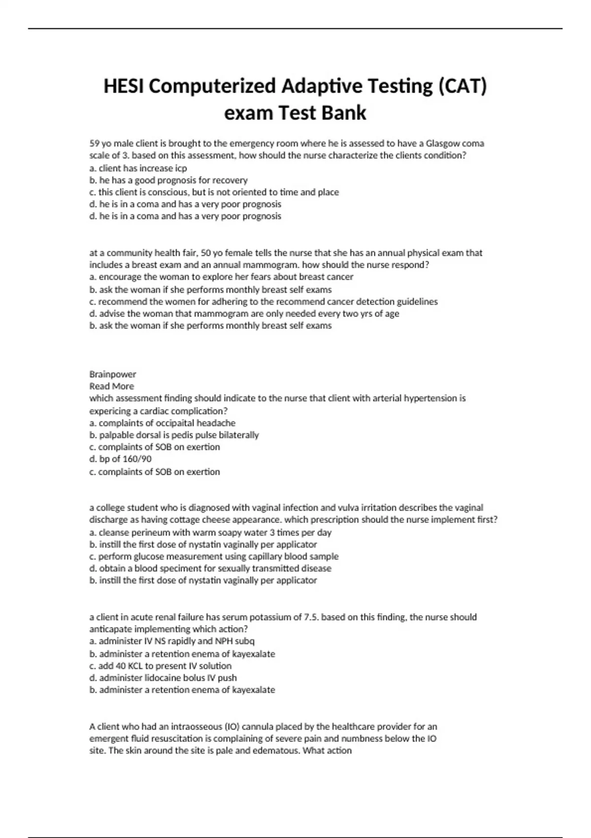 HESI CAT exam Test Bank. HESI Computerized Adaptive Testing (CAT) Test Bank With Rationales. All New
