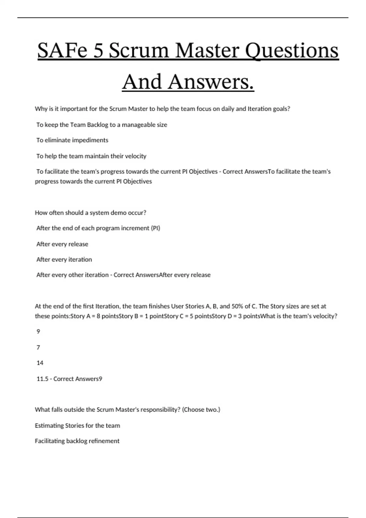 Why is it important for the Scrum Master to help the team focus on daily and Iteration goals? To keep the Team Backlog to a manageable size To eliminate impediments To help the team maintain their velocity To facilitate the team's progress towards the current PI Objectives - Correct AnswersTo facilitate the team's progress towards the current PI Objectives How often should a system demo occur? After the end of each program increment (PI) After every release After every iteration After every other iteration - Correct AnswersAfter every release At the end of the first Iteration, the team finishes User Stories A, B, and 50% of C. The Story sizes are set at these points:Story A = 8 pointsStory B = 1 pointStory C = 5 pointsStory D = 3 pointsWhat is the team's velocity? 9 7 14 11.5 - Correct Answers9 What falls outside the Scrum Master's responsibility? (Choose two.) Estimating Stories for the team Facilitating backlog refinement Assigning Stories to team members Facilitating the team's Innovation and Planning event Coaching the team - Correct AnswersEstimating Stories for the team Assigning Stories to team members The Scrum Master is what above all else? A servant leader A team coach An event facilitator The iteration owner - Correct AnswersA servant leader The SAFe Scrum Master role includes responsibilities to which other group? Business owners Solution Management Solution Train Engineers The other Agile Teams on the Agile release train (ART) - Correct AnswersThe other Agile Teams on the Agile release train (ART) When is a Feature hypothesis fully evaluated? When the Feature's return on investment has been realized When the Customer uses the Feature in production When the Feature is accepted by Product Management When the Feature has been deployed to production - Correct AnswersWhen the Customer uses the Feature in production What are two common anti-patterns during program increment (PI) planning? (Choose two.) Pressure is put on teams to overcommit A detailed plan becomes the goal rather than alignment Alignment becomes the goal rather than a detailed plan The innovation and planning (IP) iteration is left empty of planned work The team determines their own capacity and load - Correct AnswersPressure is put on teams to overcommit A detailed plan becomes the goal rather than alignment Which team dysfunction does SAFe help address with the help of Business Owners? Missed timeboxes Lack of visibility Lack of transparency Avoidance of accountability - Correct AnswersAvoidance of accountability The goal of Lean is to deliver the maximum Customer value in the shortest sustainable lead time while providing what else? The highest possible quality A Continuous Delivery Pipeline Improved capacity allocation Significant team contributions - Correct AnswersThe highest possible quality What is an example of Scrum Master servant leader behavior? Strives to create a conflict-free environment Uses persuasion instead of authority Focuses on the day-to-day team activities Keeps their opinions to themselves - Correct AnswersUses persuasion instead of authority Why is it important for a Scrum Master to be a servant leader? To drive the team to succeed To coach the team in effective engineering practices To help the team become high-performing To provide team structure - Correct AnswersTo help the team become high-performing How can a Scrum Master support a problem-solving workshop? By providing facilitation to breakout groups focused on specific problems By acting as a subject matter expert and suggesting improvements By coaching the Release Train Engineer on managing the event By estimating the work effort required to implement recommended improvements - Correct AnswersBy providing facilitation to breakout groups focused on specific problems What is the goal of the scrum of scrums event? To review the Agile Release Train's progress toward its PI Objectives To focus on Agile Release Train process improvement To review each team's progress on its Stories To demo Features to Product Management - Correct AnswersTo review the Agile Release Train's progress toward its PI Objectives Which Agile Manifesto principle describes the importance of PI Planning in SAFe? Working software is the primary measure of progress Simplicity, the art of maximizing the amount of work not done, is essential The best architectures, requirements, and designs emerge from self-organizing teams The most efficient and effective method of conveying information to and within an Agile Team is face-to-face conversation - Correct AnswersThe most efficient and effective method of conveying information to and within an Agile Team is face-to-face conversation What is one purpose of iterations? To provide an architectural basis for future development To provide a regular cadence for producing increments of value To provide fast feedback learning cycles and frequent integration To demonstrate the increment to stakeholders - Correct AnswersTo provide a regular cadence for producing increments of value What is a characteristic of an effective Scrum Master? Gives open, honest opinions Understands customer needs Is a technical expert Removes all conflict - Correct AnswersGives open, honest opinions An effective Scrum Master helps the team with what? Team metrics Relentless improvement Deploying work Risk mitigation - Correct AnswersRelentless improvement What is an innovation and planning (IP) Iteration anti-pattern? Leave the IP iteration empty of work as an estimating guard band Plan work for the IP iteration during program increment (PI) planning Plan innovation spikes or hackathons to occur during the IP iteration Use the IP iteration for infrastructure improvements - Correct AnswersPlan work for the IP iteration during program increment (PI) planning What is one benefit of program increment (PI) objectives? They describe a process for defining team goals They ensure accurate status reporting They create a near-term focus and vision They form a guid