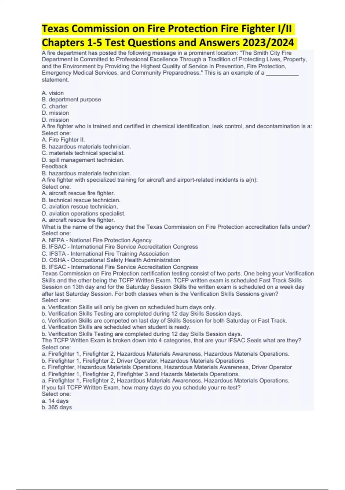 Texas Commission on Fire Protection Fire Fighter I/II Chapters 1-5 Test Questions and Answers 2024 (Verified) A fire department has posted the following message in a prominent location: "The Smith City Fire Department is Committed to Professional Excellence Through a Tradition of Protecting Lives, Property, and the Environment by Providing the Highest Quality of Service in Prevention, Fire Protection, Emergency Medical Services, and Community Preparedness." This is an example of a __________ statement. A. vision B. department purpose C. charter D. mission D. mission A fire fighter who is trained and certified in chemical identification, leak control, and decontamination is a: Select one: A. Fire Fighter II. B. hazardous materials technician. C. materials technical specialist. D. spill management technician. Feedback B. hazardous materials technician. A fire fighter with specialized training for aircraft and airport-related incidents is a(n): Select one: A. aircraft rescue fire fighter. B. technical rescue technician. C. aviation rescue technician. D. aviation operations specialist. A. aircraft rescue fire fighter. What is the name of the agency that the Texas Commission on Fire Protection accreditation falls under? Select one: A. NFPA - National Fire Protection Agency B. IFSAC - International Fire Service Accreditation Congress C. IFSTA - International Fire Training Association D. OSHA - Occupational Safety Health Administration B. IFSAC - International Fire Service Accreditation Congress Texas Commission on Fire Protection certification testing consist of two parts. One being your Verification Skills and the other being the TCFP Written Exam. TCFP written exam is scheduled Fast Track Skills Session on 13th day and for the Saturday Session Skills the written exam is scheduled on a week day after last Saturday Session. For both classes when is the Verification Skills Sessions given? Select one: a. Verification Skills will only be given on scheduled burn days only. b. Verification Skills Testing are completed during 12 day Skills Session days. c. Verification Skills are competed on last day of Skills Session for both Saturday or Fast Track. d. Verification Skills are scheduled when student is ready. b. Verification Skills Testing are completed during 12 day Skills Session days. The TCFP Written Exam is broken down into 4 categories, that are your IFSAC Seals what are they? Select one: a. Firefighter 1, Firefighter 2, Hazardous Materials Awareness, Hazardous Materials Operations. b. Firefighter 1, Firefighter 2, Driver Operator, Hazardous Materials Operations c. Firefighter, Hazardous Materials Operations, Hazardous Materials Awareness, Driver Operator d. Firefighter 1, Firefighter 2, Firefighter 3 and Hazards Materials Operations. a. Firefighter 1, Firefighter 2, Hazardous Materials Awareness, Hazardous Materials Operations. If you fail TCFP Written Exam, how many days do you schedule your re-test? Select one: a. 14 days b. 365 days Texas Commission on Fire Protection Fire Fighter I/II Chapters 1-5 Test Questions and Answers. c. 12 days d. 180 days d. 180 days Passing our course and TCFP Exams does not mean you are automatically certified. You must apply for TCFP Certification and IFSAC Seals if desired and eligible. Steps to becoming a certified firefighter is listed on TCFP Website. Their is an expiration on your TCFP written exam until the time you apply for certification. How long do you have before the TCFP Written Exam expires? Select one: a. 6 months b. 5 years c. 1 year d. 2 Years d. 2 Years On JB Learning you are required to complete FAO quizzes for each Chapter or Lesson Pathway, you will receive the highest grade on how many attempts? Select one: a. 10 b. 4 c. 3 d. 2 d. 2 Incomplete Homework or FAO Quizzes will result in... Select one: a. Ineligibility to participate in Skills Session. b. Ineligibility to participate in Verification Skills Testing. c. Automatically Withdraw. d. Ineligibility to participate in Burn Days. a. Ineligibility to participate in Skills Session. The Hands-On Skills Session is what it implies. The majority of each day will be spent outside demonstrating mastery of skills that have been covered in the on-line portion of training. It is vital that every student is prepared physically for outside working conditions. To ensure what document is required to turn in on first day of skills in order for student to participate in Skills Session? Select one: a. Liability Form. b. Insurance Card. c. Physical Exam. d. Permission Slip. c. Physical Exam. Attendance is mandatory for all skills sessions. We understand emergencies come up, failure to notify FAO Instructor or Staff member could result in automatic withdraw from the course. There are "Special Days" that may hinder the attempt to make-up missed skills days include: Verification Skills Day, HazMat Day, Vehical Extrication and Burn Days. FAO will work with students to make up missed time, what options does this include? Select one: a. All the above are options. b. Staying after skills session day to make-up with FAO Instructor. (Subject to Instructor fee $35 per hour). c. Make-Up with current class. (Sat. Session make up with FT Skills vice versa). d. Transfer Fee $100 to move to next available class. a. All the above are options. Medical requirements for fire fighters are specified in which NFPA standard? Select one: A. 904 B. 1582 Texas Commission on Fire Protection Fire Fighter I/II Chapters 1-5 Test Questions and Answers. C. 1962 D. 1002 B. 1582 NFPA standards are ____________ codes and standards: Select one: A. prescriptive. B. authoritative. C. administrative law. D. consensus-based. D. consensus-based. Organizing an incident by breaking down the overall strategy into a series of smaller tasks is an example of: Select one: A. division of labor. B. discipline. C. unity of command. D. span of control. A. division of labor. Specific information on the actions to be taken to accomplish a certain task is provi