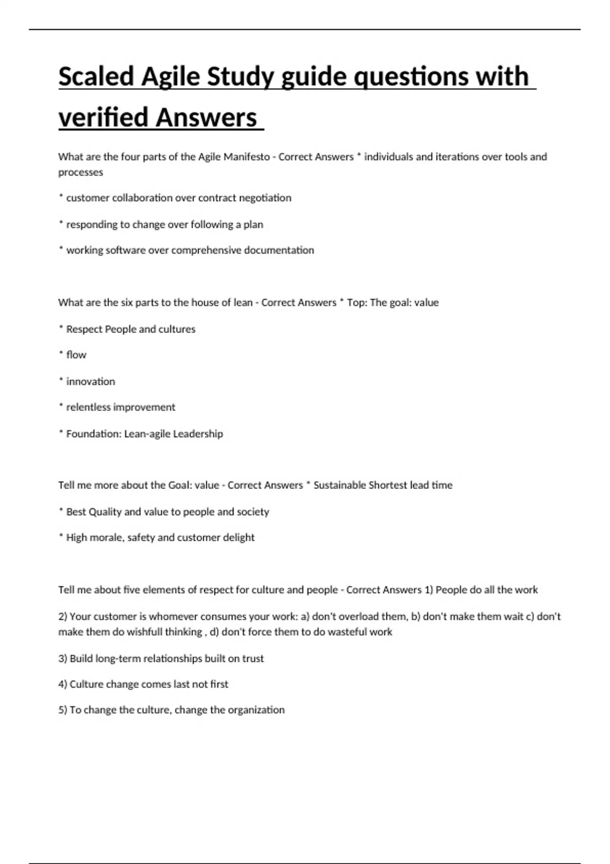 What are the four parts of the Agile Manifesto - Correct Answers * individuals and iterations over tools and processes * customer collaboration over contract negotiation * responding to change over following a plan * working software over comprehensive documentation What are the six parts to the house of lean - Correct Answers * Top: The goal: value * Respect People and cultures * flow * innovation * relentless improvement * Foundation: Lean-agile Leadership Tell me more about the Goal: value - Correct Answers * Sustainable Shortest lead time * Best Quality and value to people and society * High morale, safety and customer delight Tell me about five elements of respect for culture and people - Correct Answers 1) People do all the work 2) Your customer is whomever consumes your work: a) don't overload them, b) don't make them wait c) don't make them do wishfull thinking , d) don't force them to do wasteful work 3) Build long-term relationships built on trust 4) Culture change comes last not first 5) To change the culture, change the organization (wishful thinking when lack of integration and you don't know if thing are really working) What are the five elements of flow - Correct Answers 1) Optimize continous and sustainable throughput of value 2) Build in quality, flow depends on it. 3) Avoid start-stop-start delays 4) Understand, exploit and manage variabiltiy 5) use informed decision making via fast feedback 6) 5 rules of innovation - Correct Answers 1) Producers innovate, customers validate 2) Get out of the office 3) Provide time and space for creativity 4) Apply innovation accounting (metrics) 5) Pivot without mercy or guilt Relentless Improvement: What are 5 elements - Correct Answers 1) a Constant sense of Danger (remember the competition) 2) Optimize the whole 3) Consider facts carefully, then move quickly 4) Apply lean tools to identify and address root causes 5) Reflect at key milestones, identify and address shortcomings What is the foundation of the house of lean. What are it's foundations - Correct Answers * Management applies and teaches lean. THey are in charge of charge, they play an active part. what are the 9 SAFe principles - Correct Answers ESVIM WC MD 1) Take the economic view 2) Apply system's thinking 3) Assume variability, preserve options 4) Build incrementally with fast, integrated learning cycles 5) Base milestones on objective evaluation of working systems 6) Visualize and limit WIP, reduce batch sizes, and manage queue lengths 7) apply cadence, synchronize with cross =domain planning 8) unlock the intrinsice motivation of knowledge workers 9) decentralize decision making.