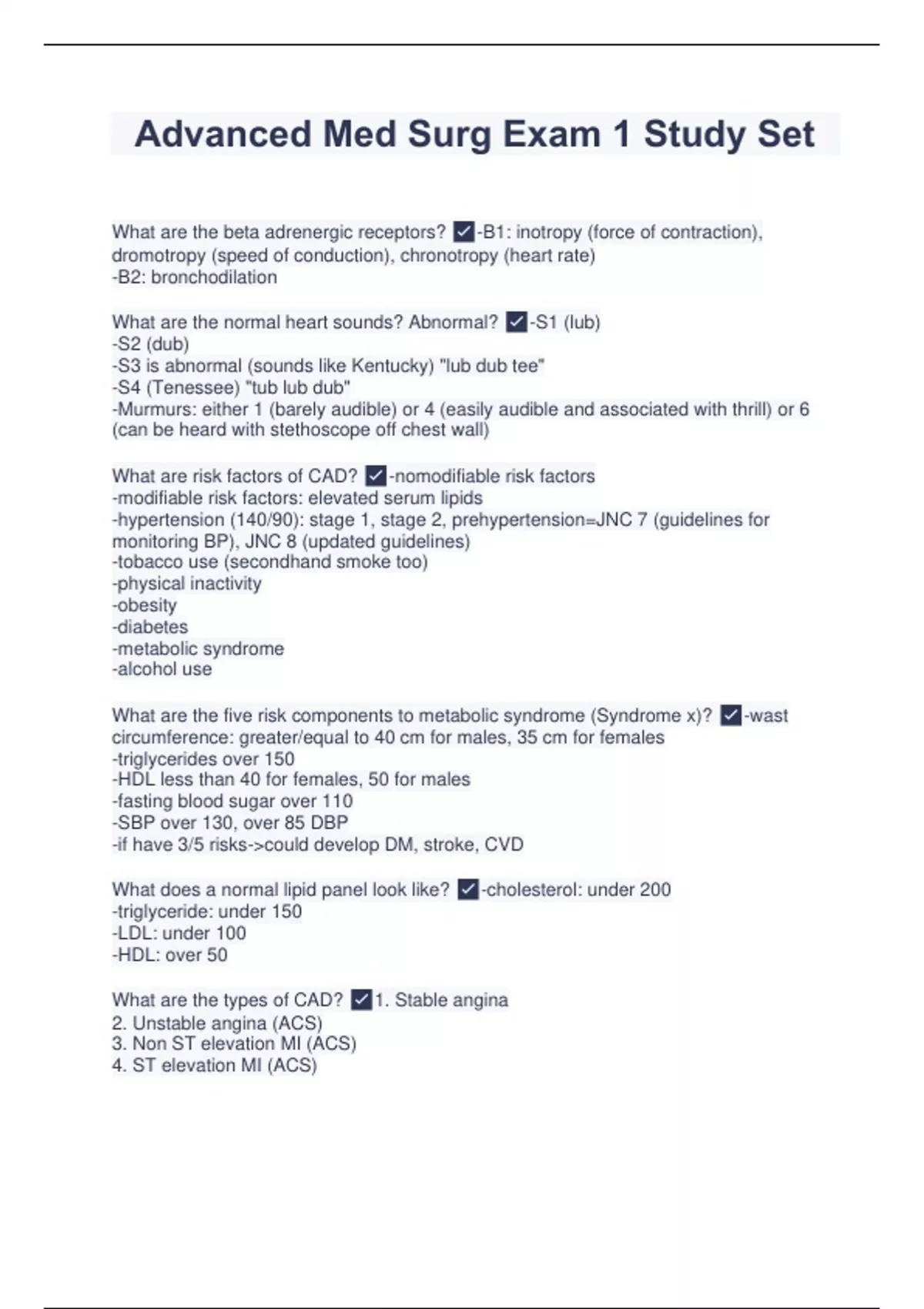 What are the beta adrenergic receptors? -B1: inotropy (force of contraction), dromotropy (speed of conduction), chronotropy (heart rate) -B2: bronchodilation What are the normal heart sounds? Abnormal? -S1 (lub) -S2 (dub) -S3 is abnormal (sounds like Kentucky) "lub dub tee" -S4 (Tenessee) "tub lub dub" -Murmurs: either 1 (barely audible) or 4 (easily audible and associated with thrill) or 6 (can be heard with stethoscope off chest wall) What are risk factors of CAD? -nomodifiable risk factors -modifiable risk factors: elevated serum lipids -hypertension (140/90): stage 1, stage 2, prehypertension=JNC 7 (guidelines for monitoring BP), JNC 8 (updated guidelines) -tobacco use (secondhand smoke too) -physical inactivity -obesity -diabetes -metabolic syndrome -alcohol use What are the five risk components to metabolic syndrome (Syndrome x)? -wast circumference: greater/equal to 40 cm for males, 35 cm for females -triglycerides over 150 -HDL less than 40 for females, 50 for males -fasting blood sugar over 110 -SBP over 130, over 85 DBP -if have 3/5 risks-could develop DM, stroke, CVD What does a normal lipid panel look like? -cholesterol: under 200 -triglyceride: under 150 -LDL: under 100 -HDL: over 50