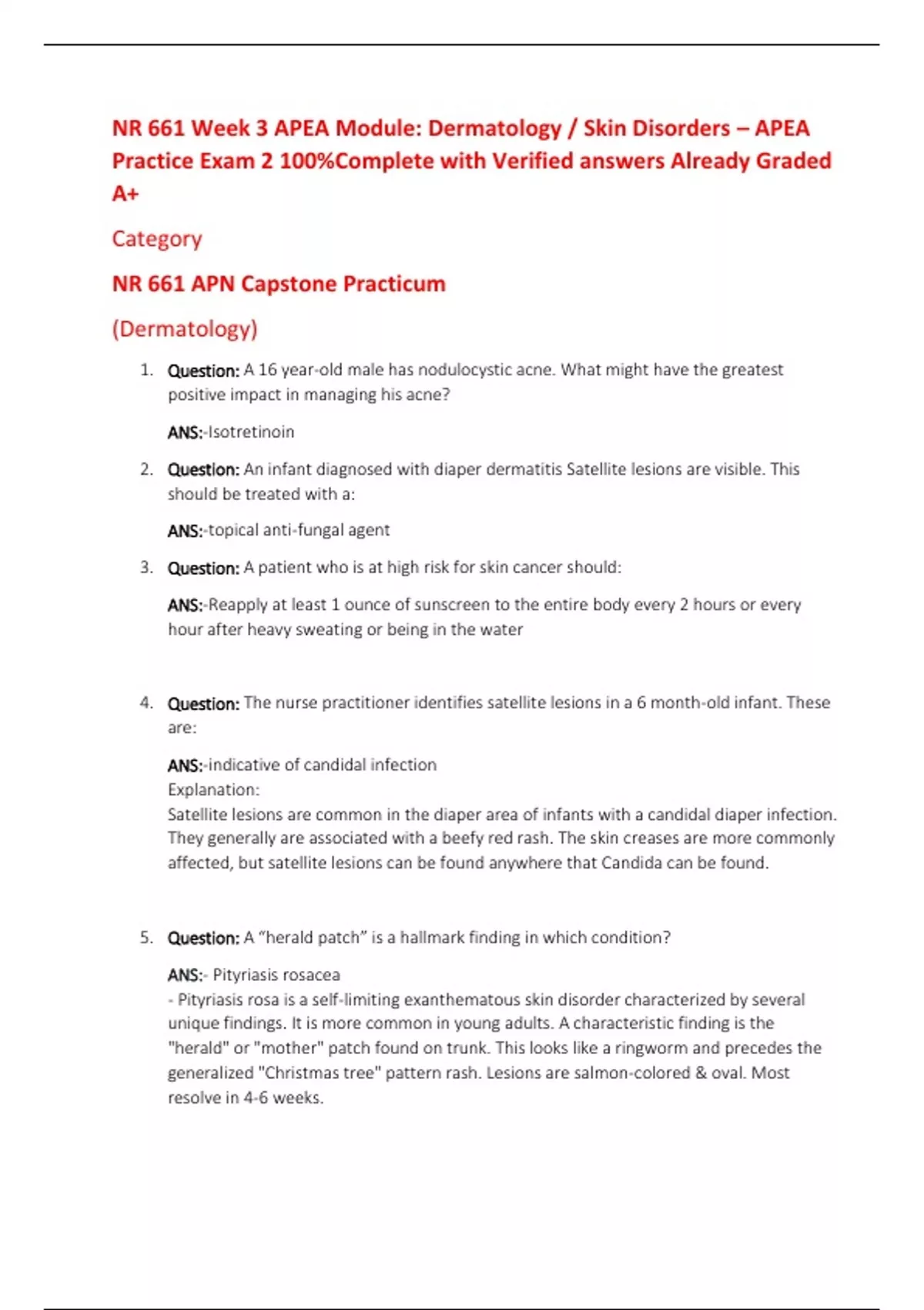 NR 661 Week 3 APEA Module: Dermatology / Skin Disorders – APEA Practice Exam 2 100%Complete with Verified answers Already Graded A+ Category NR 661 APN Capstone Practicum (Dermatology) 1. Question: A 16 year-old male has nodulocystic acne. What might have the greatest positive impact in managing his acne? ANS:-Isotretinoin 2. Question: An infant diagnosed with diaper dermatitis Satellite lesions are visible. This should be treated with a: ANS:-topical anti-fungal agent 3. Question: A patient who is at high risk for skin cancer should: ANS:-Reapply at least 1 ounce of sunscreen to the entire body every 2 hours or every hour after heavy sweating or being in the water 4. Question: The nurse practitioner identifies satellite lesions in a 6 month-old infant. These are: ANS:-indicative of candidal infection Explanation: Satellite lesions are common in the diaper area of infants with a candidal diaper infection. They generally are associated with a beefy red rash. The skin creases are more commonly affected, but satellite lesions can be found anywhere that Candida can be found. 5. Question: A “herald patch” is a hallmark finding in which condition