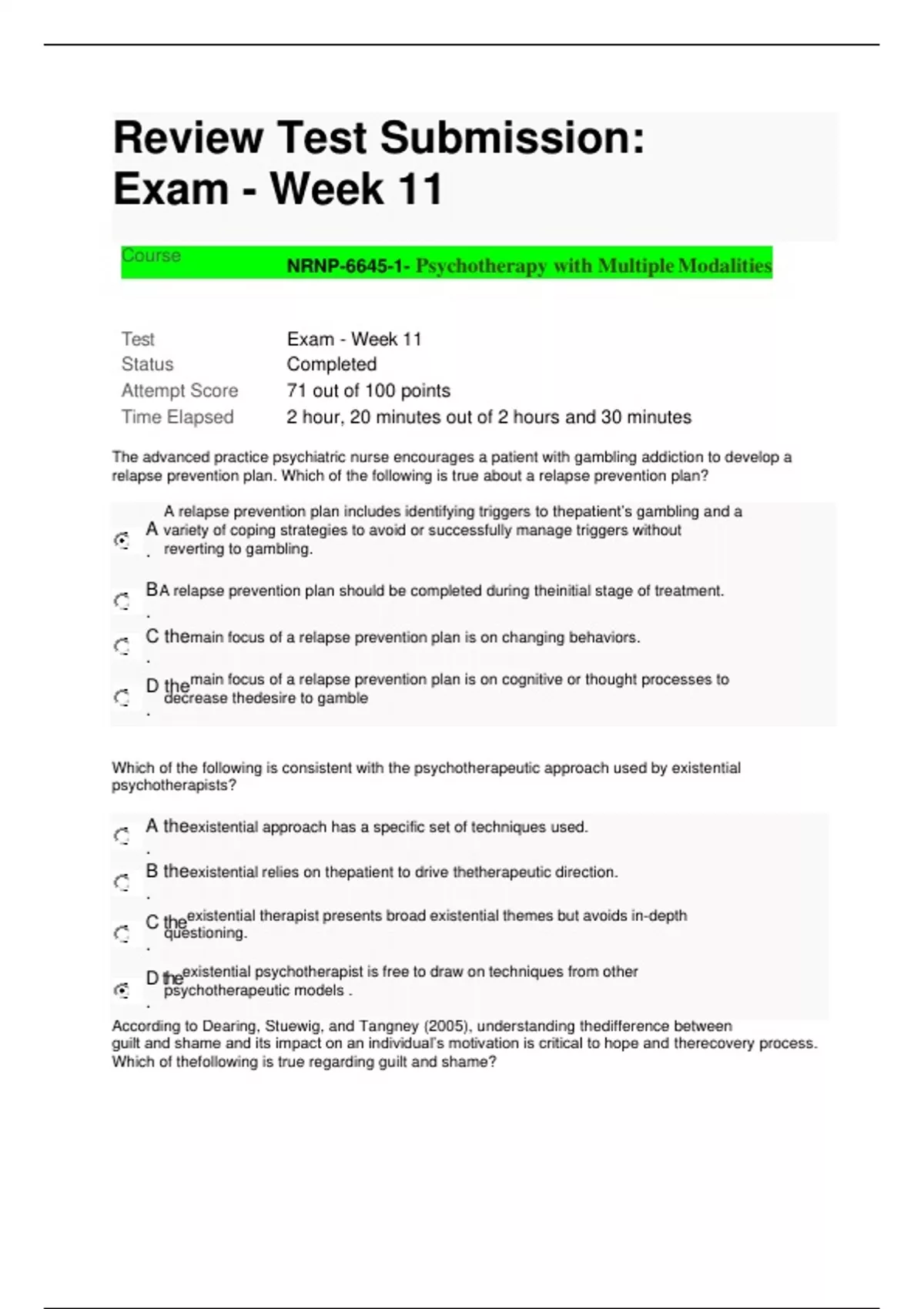 NUR 212 Final Exam-with 100% verified answers-2022- 2023 GRADED A 1.1M8EN212 1.66 points possible (graded, results hidden) A client with Alzheimer’s disease has had recent episodes of confabulation. The client is most likely in which stage of Alzheimer’s? Stage 5 Stage 4 Stage 3 submitted Submit You have used 1 of 1 attemptSome problems have options such as save, reset, hints, or show answer. These options follow the Submit button. Answer submitted. Review 2.2M8EN212 1.66 points possible (graded, results hidden) Which statement made by a client in a mental health clinic demonstrates the use of denial as a coping measure? “It is my doctor’s fault that I am not improving.” “I don’t need my medication anymore.” “I am not going to come in anymore, as I have no problems.” submitted Submit You have used 1 of 1 attemptSome problems have options such as save, reset, hints, or show answer. These options follow the Submit button. Answer submitted. Review 3.2M8EN212 1.66 points possible (graded, results hidden) A student nurse is about to take an exam and develops shortness of breath, palpitations, severe trembling, diaphoresis, dilated pupils, and chest pain. The RN would assess this as which level of anxiety? Panic Average Severe submitted Submit You have used 1 of 1 attemptSome problems have options such as save, reset, hints, or show answer. These options follow the Submit button. Answer submitted. Review 4.1M8EN212 1.66 points possible (graded, results hidden) A client who has been diagnosed with dementia asks the RN when his wife is coming to visit. The RN knows the client has been a widow for many years. The most appropriate response by the RN would be: “You must miss your wife.” “I think your favorite TV show is on.” “Your wife died 10 years ago.” submitted Submit You have used 1 of 1 attemptSome problems have options such as save, reset, hints, or show answer. These options follow the Submit button. Answer submitted. Review 5.1M8EN212 1.66 points possible (graded, results hidden) Which nursing intervention is the most appropriate use of behavior therapy when caring for a client with Bordorline Personality Disorder? Contract with the client to reinforce positive behaviors with rewards or privileges. Encourage the client to keep a journal of feelings to manage mood swings. Education the client on the importance of taking the antianxiety medications regularly. submitted Submit You have used 1 of 1 attemptSome problems have options such as save, reset, hints, or show answer. These options follow the Submit button. Answer submitted. Review 6.2M8EN212 1.66 points possible (graded, results hidden) A client is taking buproprion for smoking cessation. What adverse reaction should the nurse monitor for related to this medication? Seizures Weight loss Anxiety submitted Submit You have used 1 of 1 attemptSome problems have options such as save, reset, hints, or show answer. These options follow the Submit button. Answer submitted. Review 7.1M8EN212 1.66 points possible (graded, results hidden
