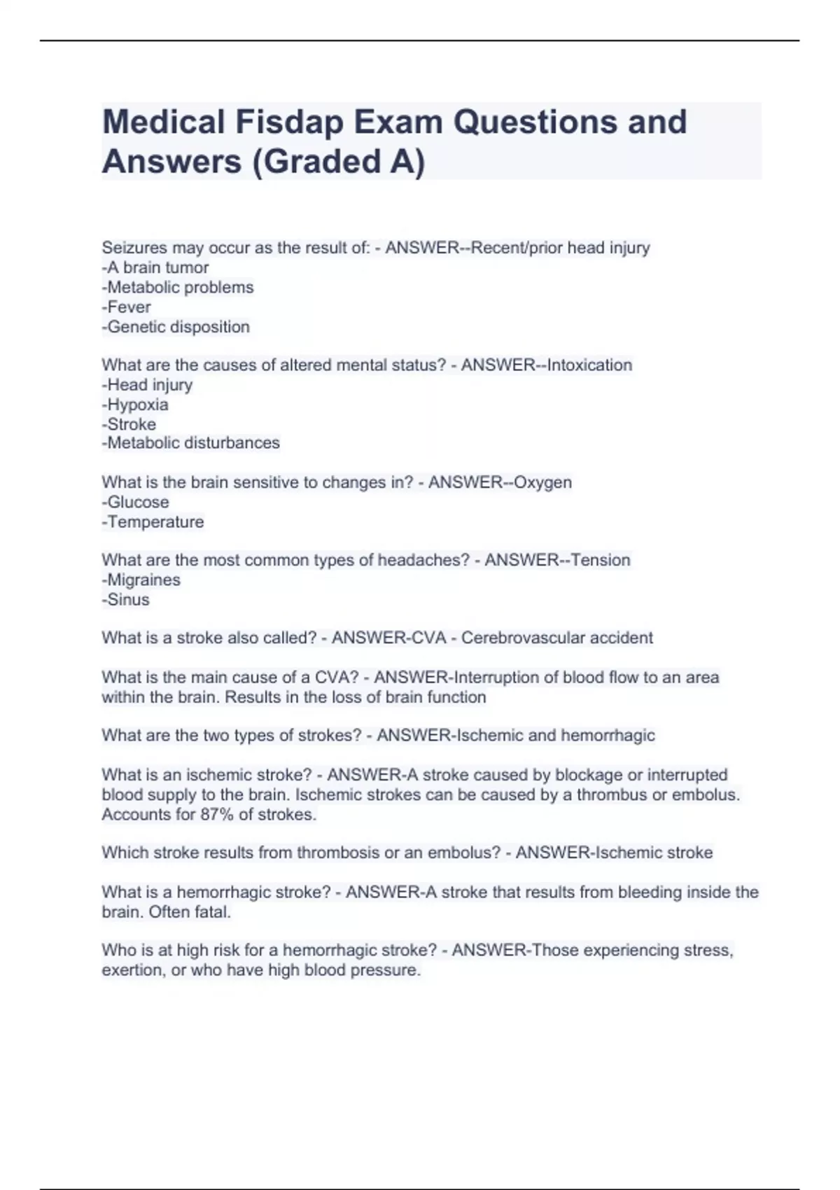 Medical Fisdap Exam Questions and Answers (Graded A) Medical Fisdap Exam Questions and Answers (Graded A) Medical Fisdap Exam Questions and Answers (Graded A) Seizures may occur as the result of: - ANSWER--Recent/prior head injury -A brain tumor -Metabolic problems -Fever -Genetic disposition What are the causes of altered mental status? - ANSWER--Intoxication -Head injury -Hypoxia -Stroke -Metabolic disturbances What is the brain sensitive to changes in? - ANSWER--Oxygen -Glucose -Temperature What are the most common types of headaches? - ANSWER--Tension -Migraines -Sinus What is a stroke also called? - ANSWER-CVA - Cerebrovascular accident What is the main cause of a CVA? - ANSWER-Interruption of blood flow to an area within the brain. Results in the loss of brain function